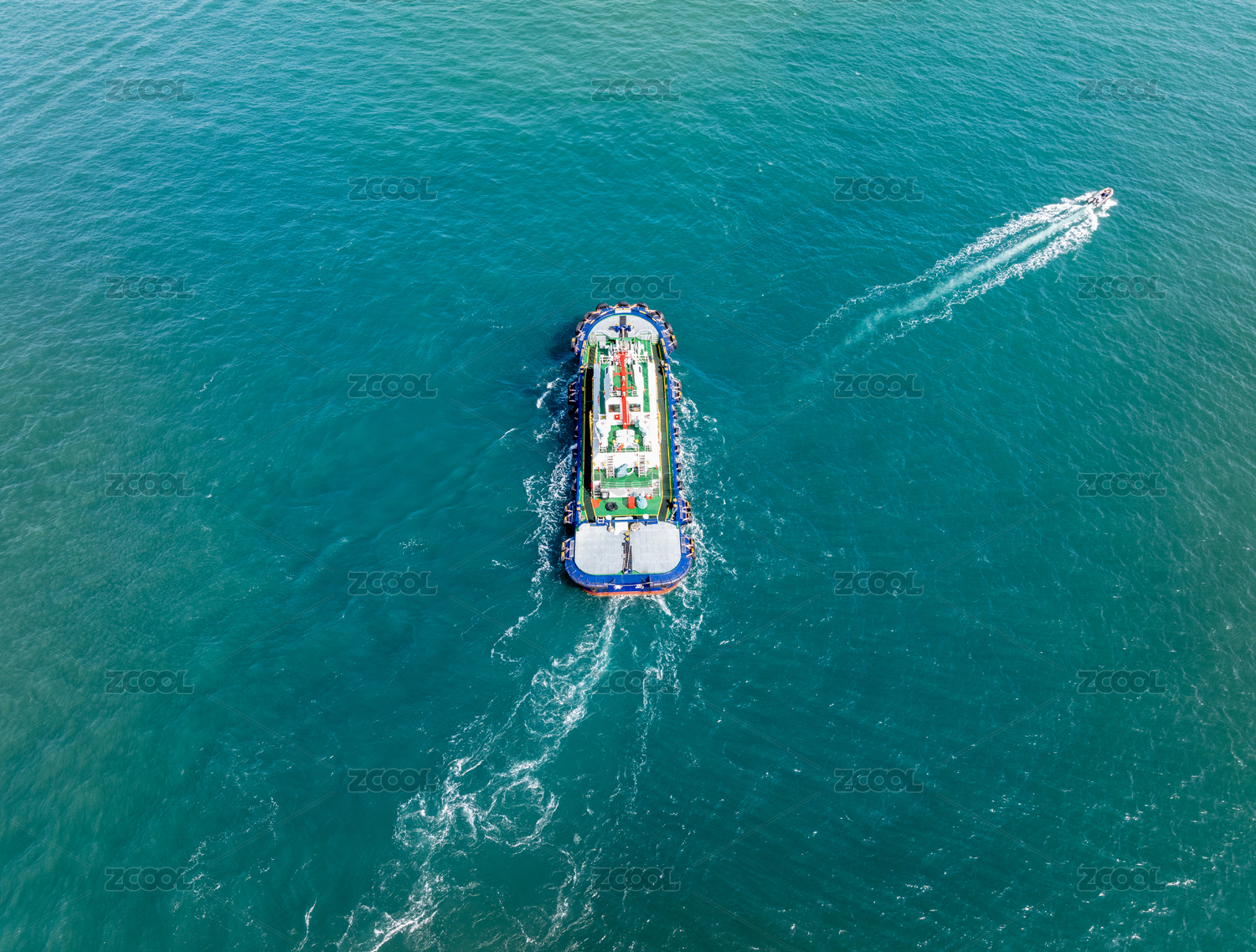 航拍視角一艘拖船航行在海上