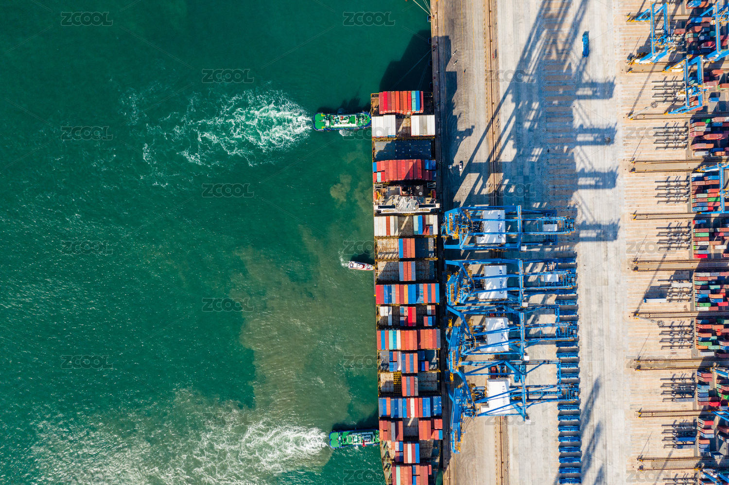 航拍一艘散貨船在拖船的牽引下駛向碼頭
