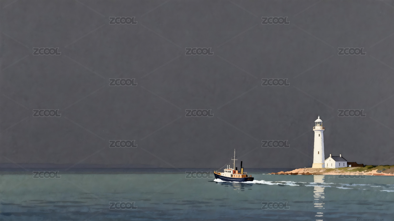 白色燈塔矗立礁石島,藍白拖船航行