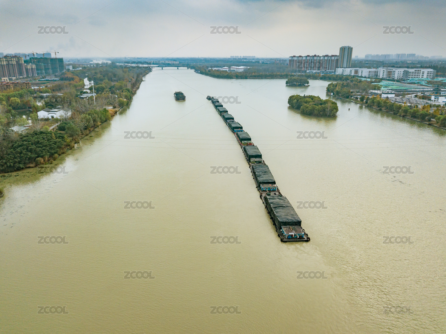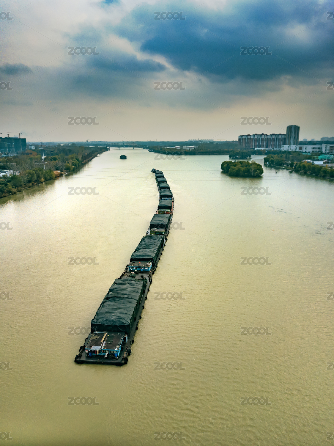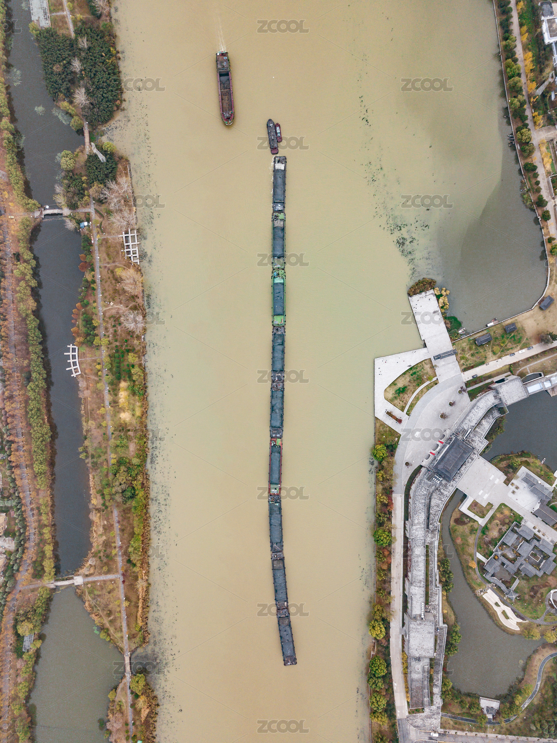 航拍一艘采砂船行駛在江面上頂視圖