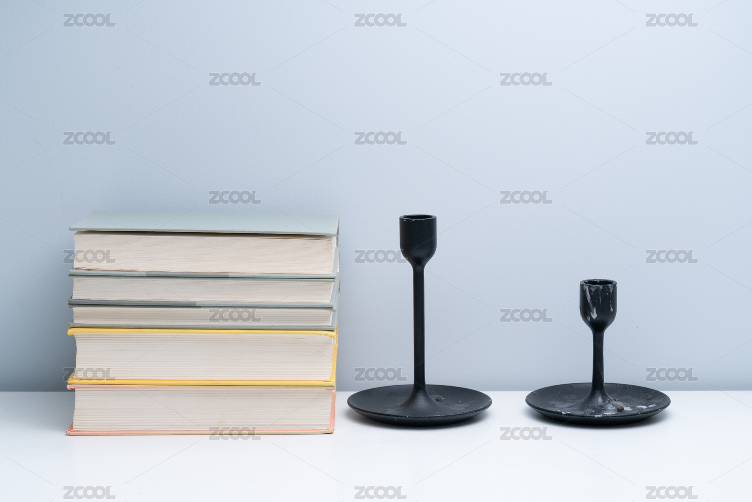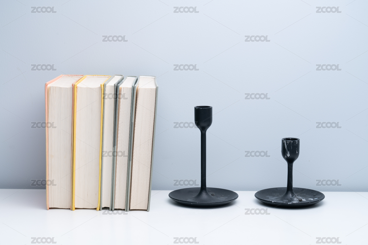 黑色的燭臺(tái)和書籍放在白色桌面上