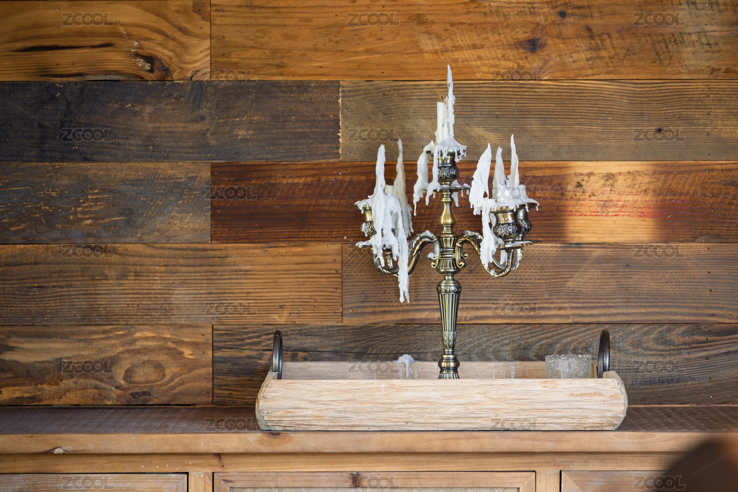 復(fù)古燭臺(tái)置于木質(zhì)背景前的裝飾場(chǎng)景