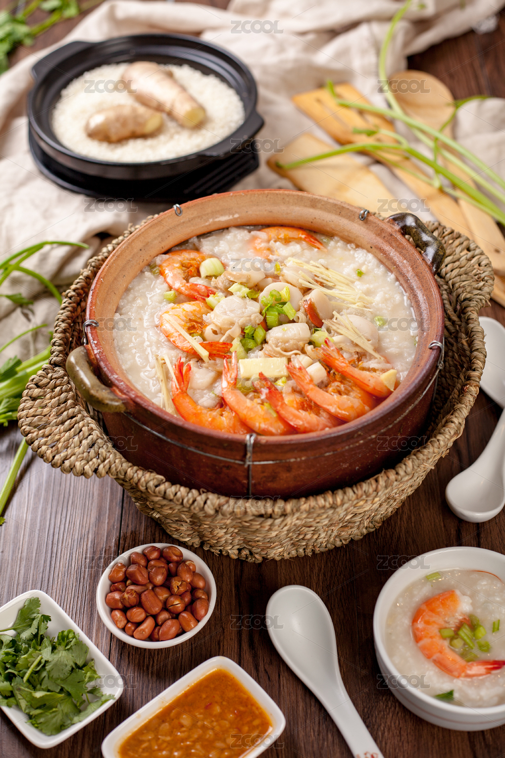 木勺舀取的鮮蝦牡蠣海鮮粥