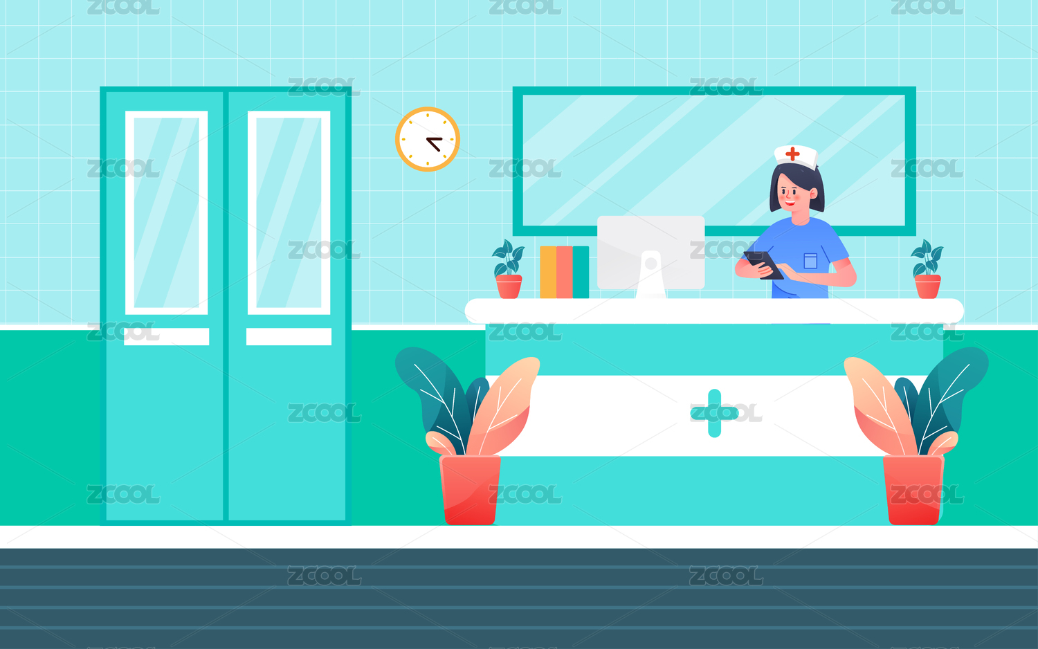 醫(yī)院前臺場景醫(yī)生護(hù)士疫情預(yù)防病情矢量插畫