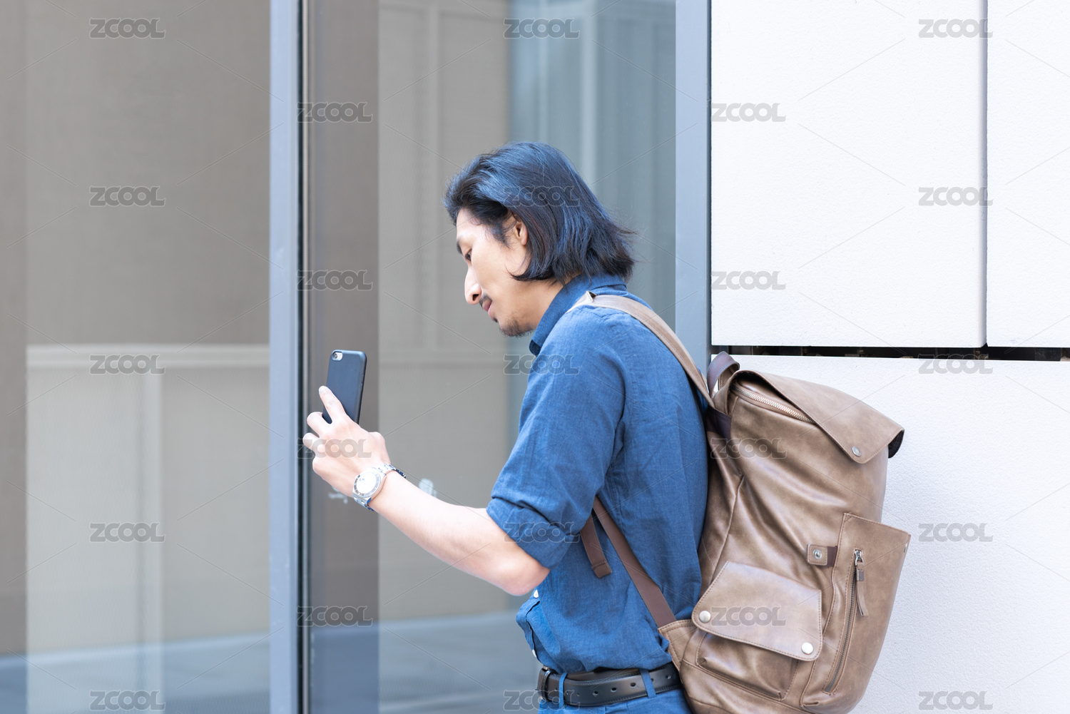 年輕帥氣的商務(wù)男士在寫字樓前用手機(jī)拍照
