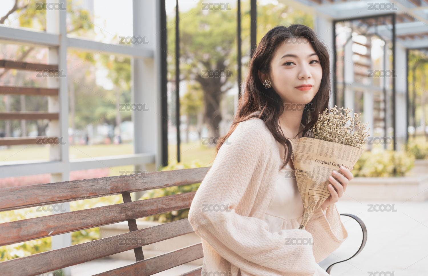 溫柔的卷發(fā)女生捧著花束坐在公園里