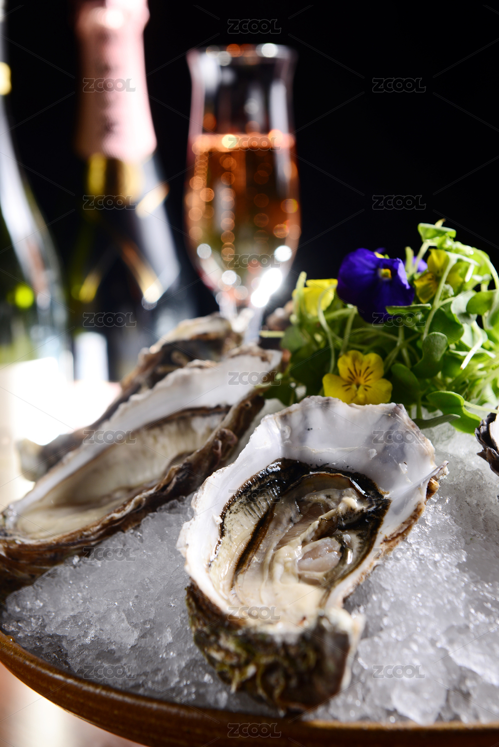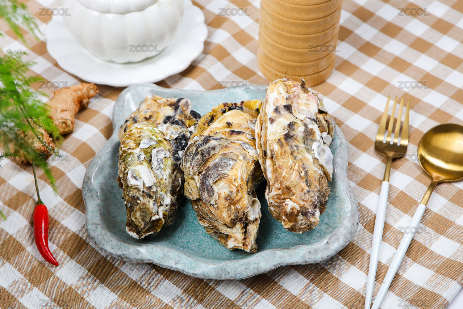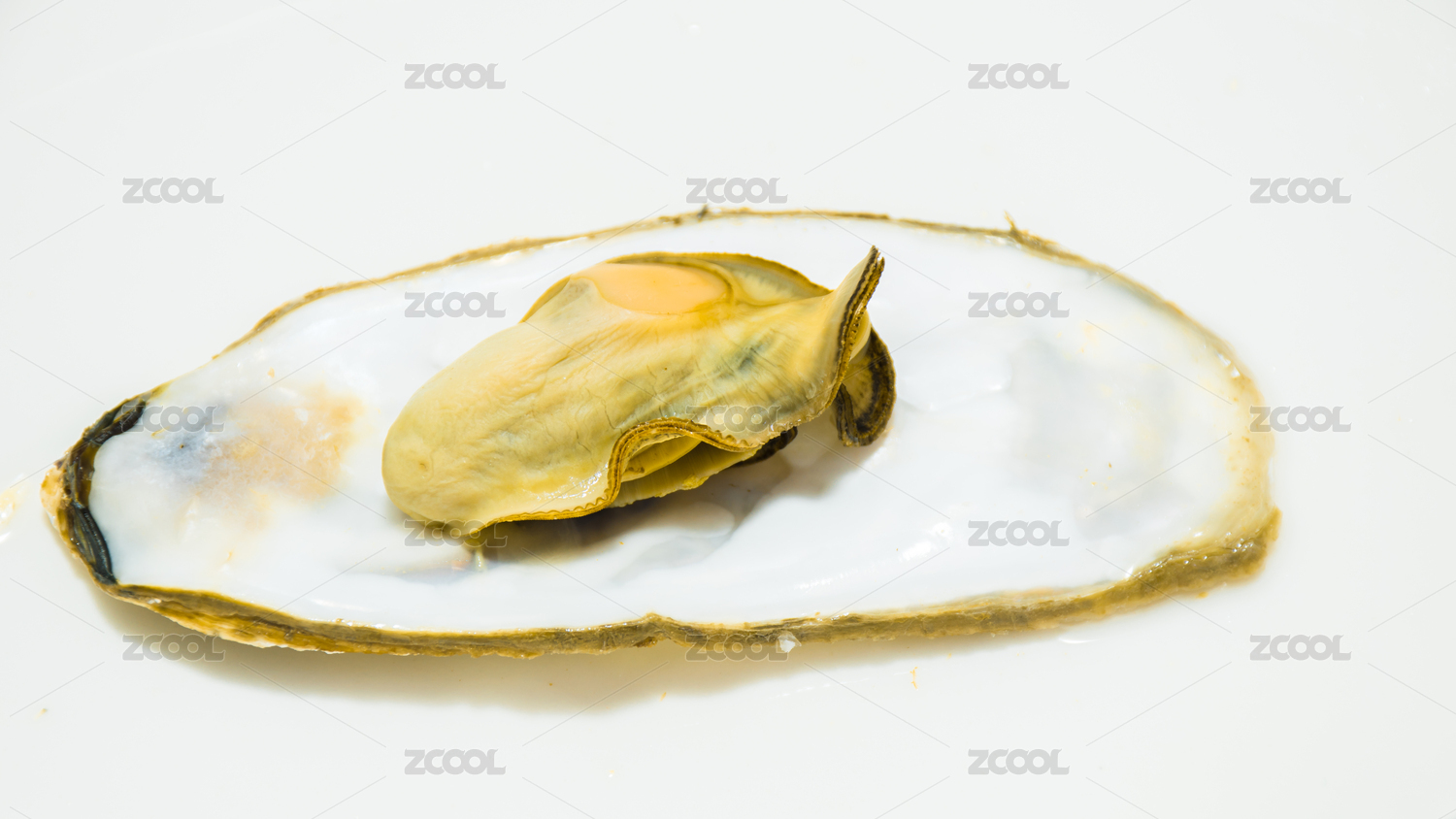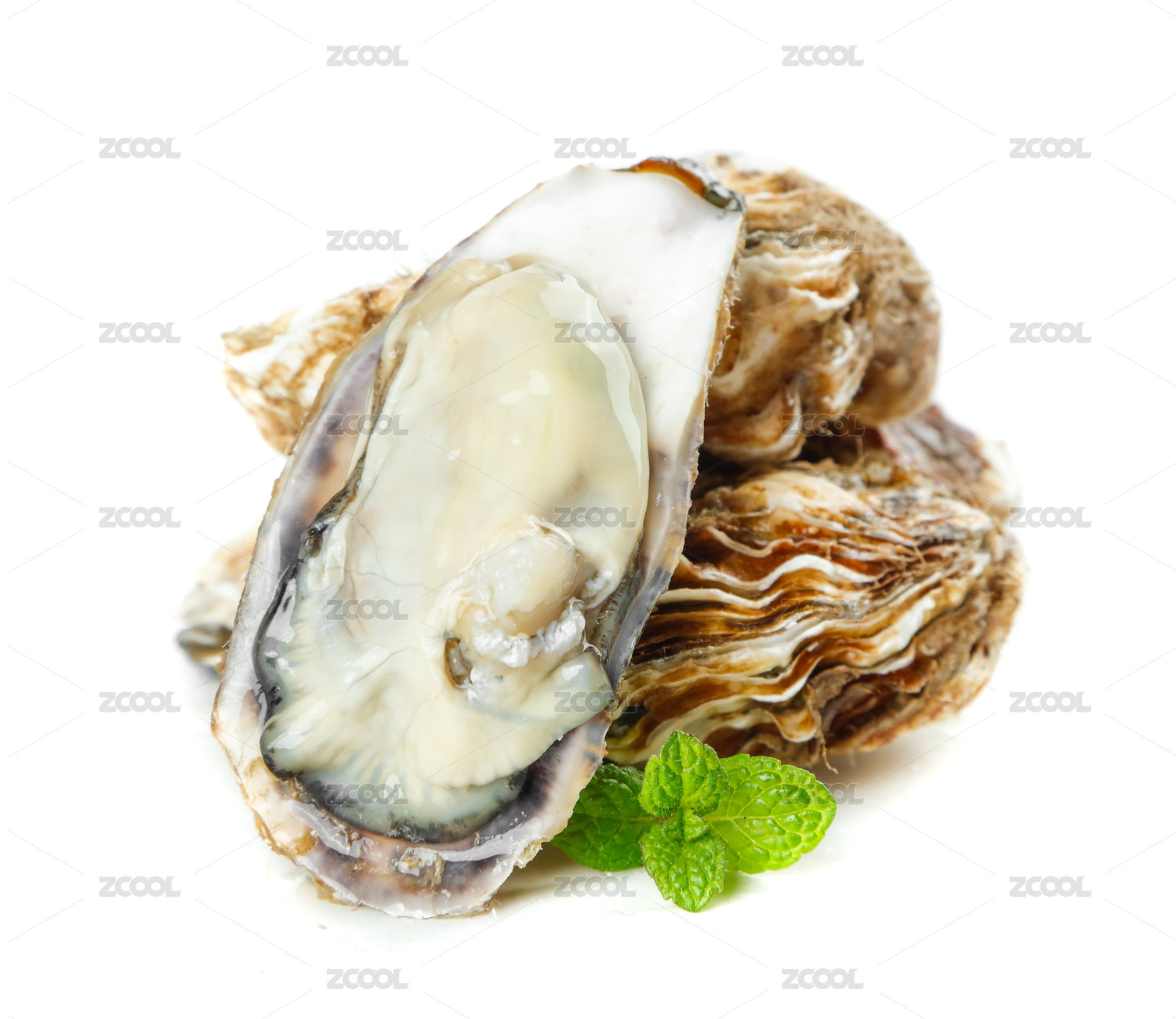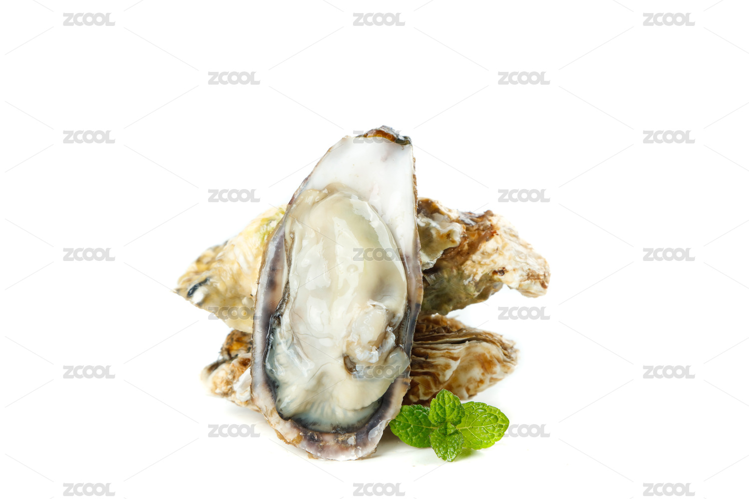 白底上放著兩個(gè)鮮活牡蠣和半邊撬開的牡蠣