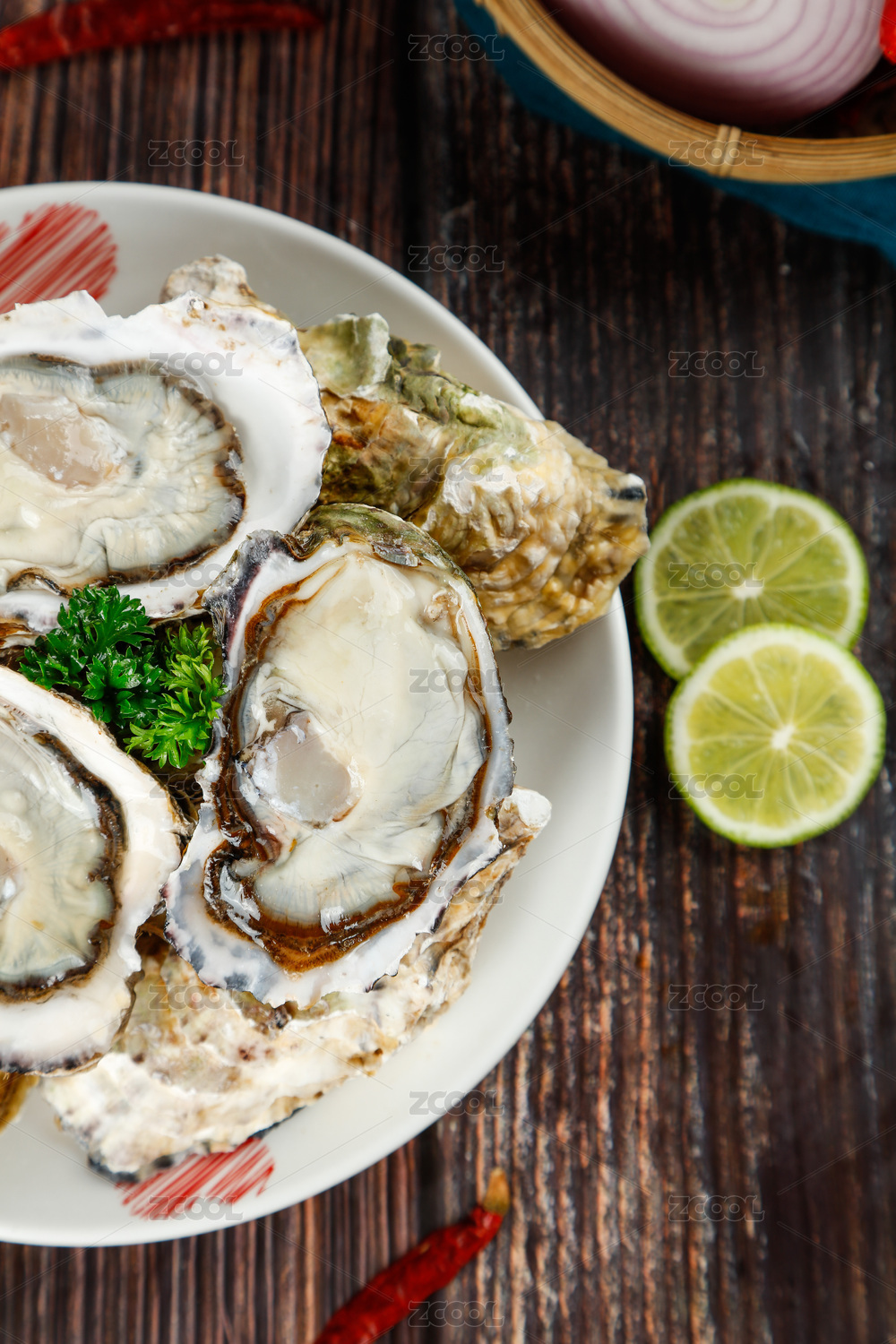 擺放在白色盤子里的牡蠣高清特寫