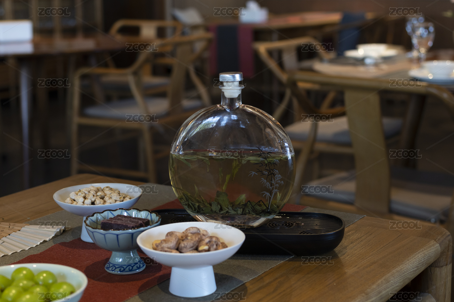茶館木桌上玻璃瓶沖泡的綠茶與茶點(diǎn)