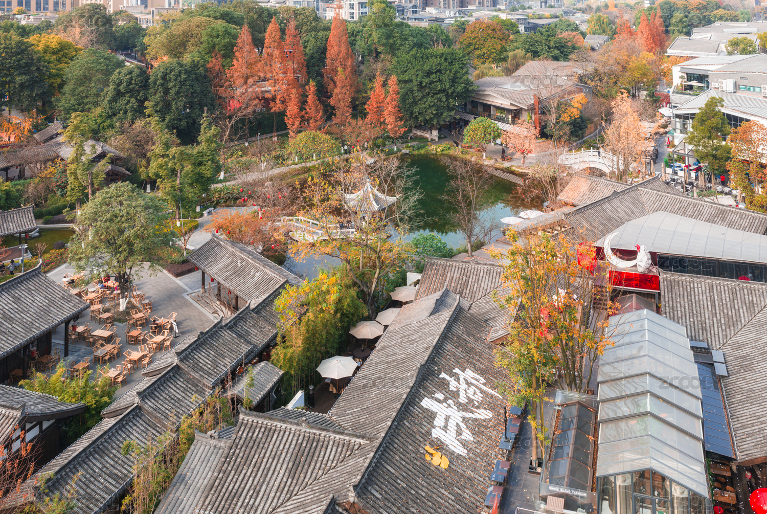 中國(guó)四川成都鐵像寺水街露天老茶館航拍圖
