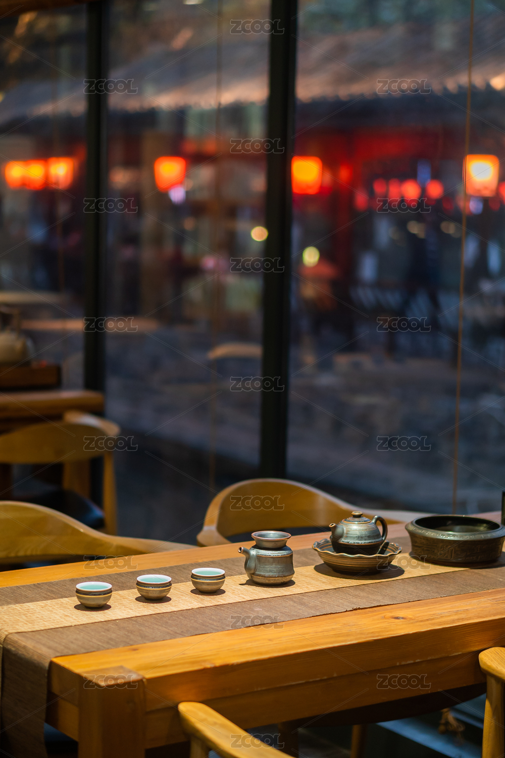 花窗內(nèi)中式茶館一角
