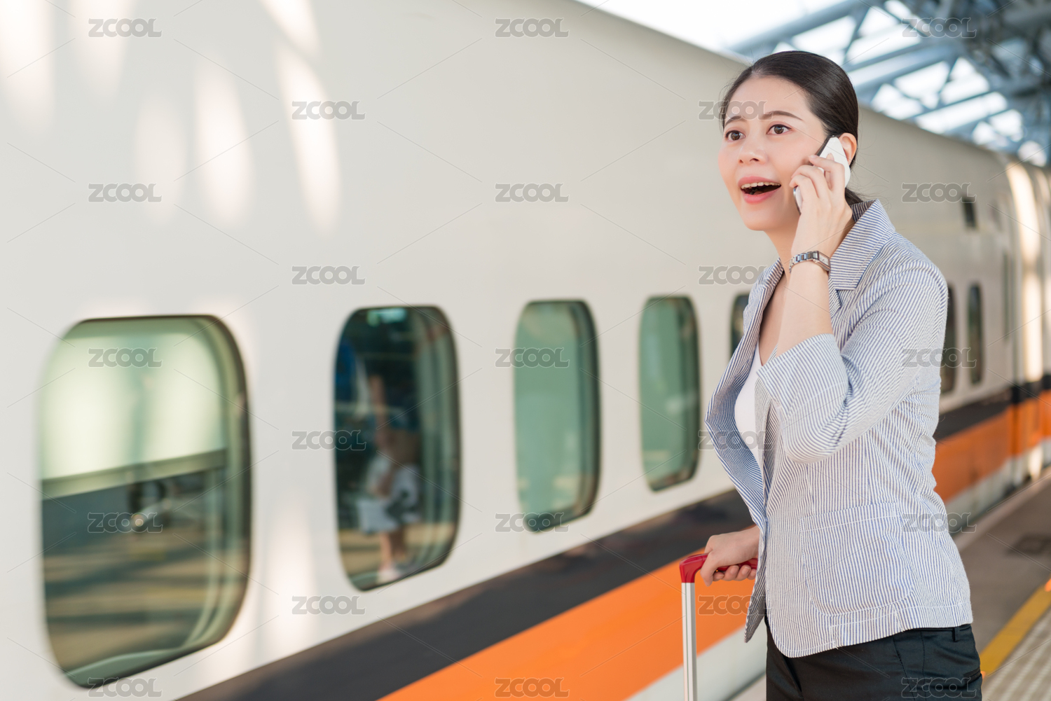 美麗的亞裔女商人在電話交談與她的客戶,等待她的火車到站為她準(zhǔn)備啟程。