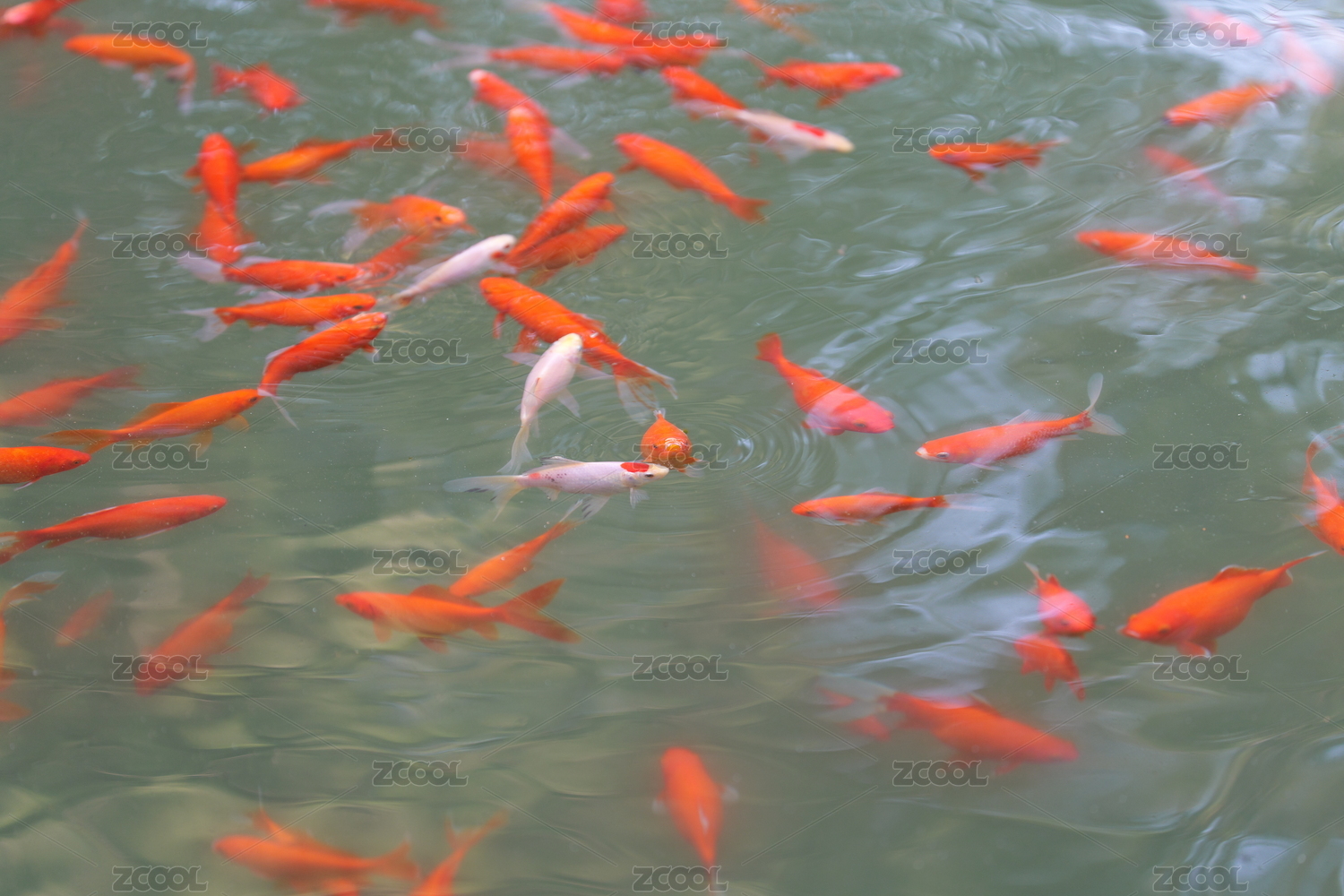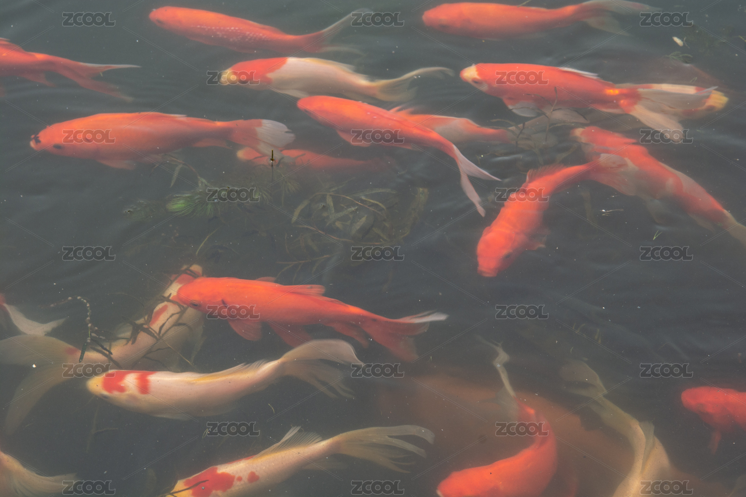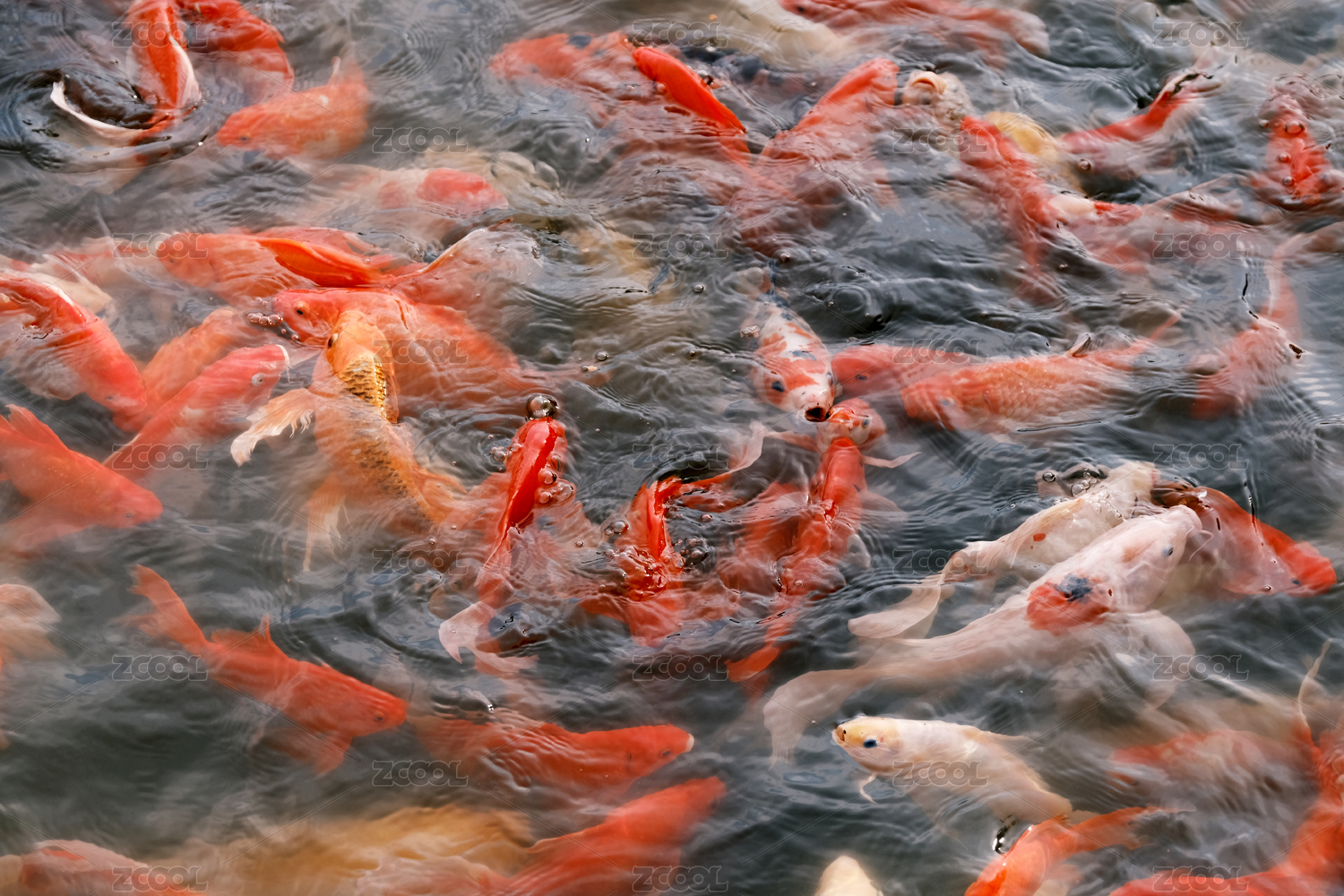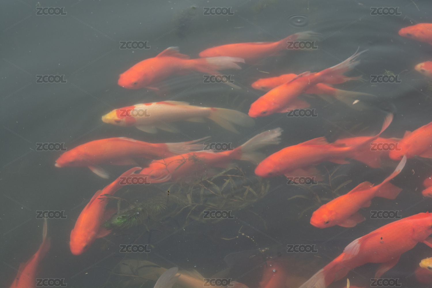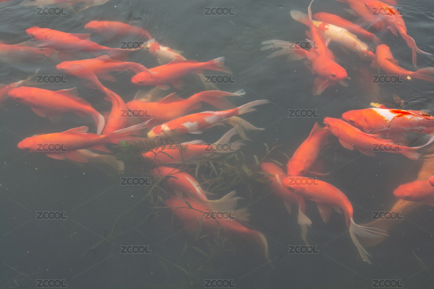 許多鮮艷紅色的錦鯉鯉魚在水池里游動
