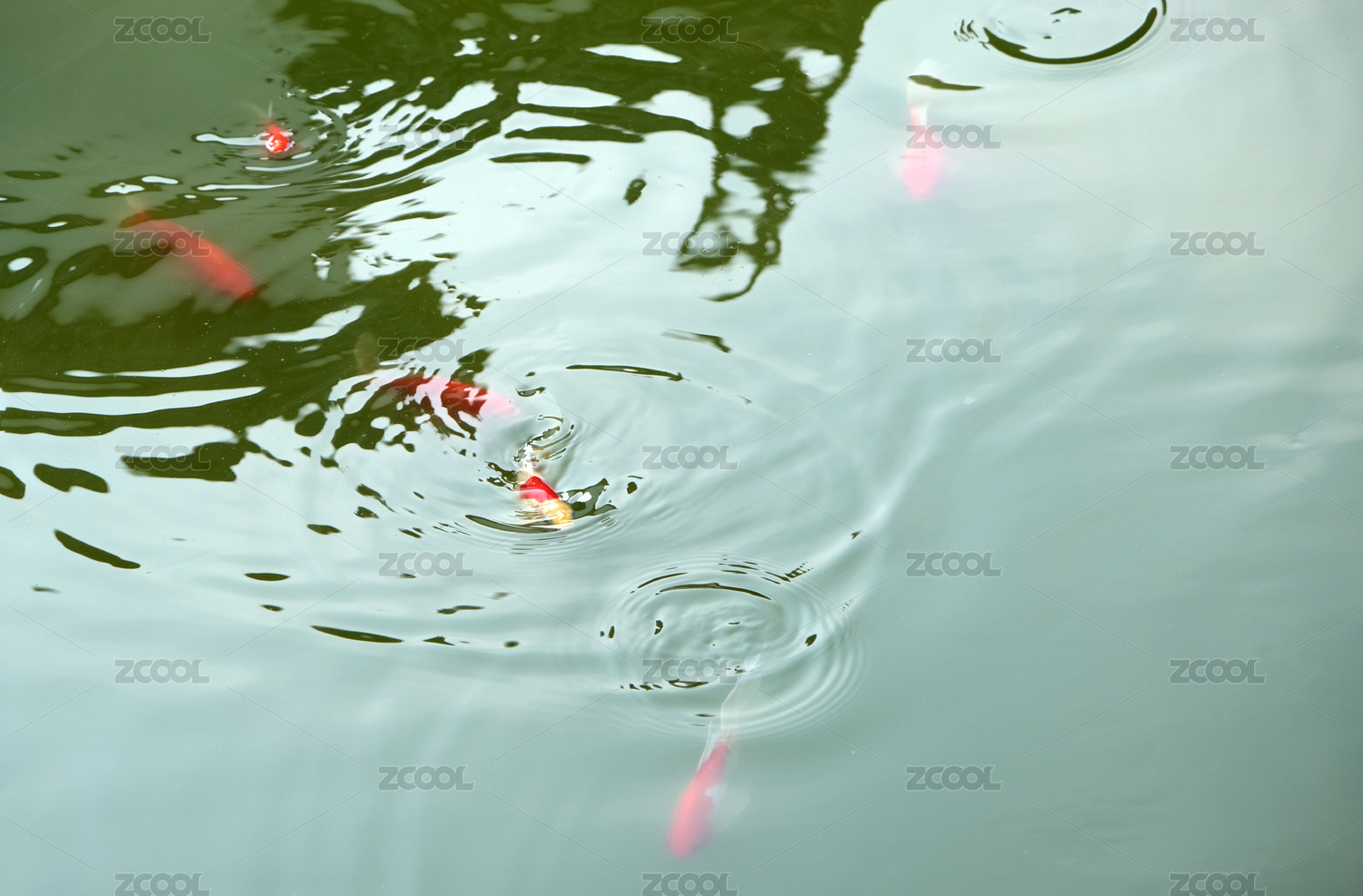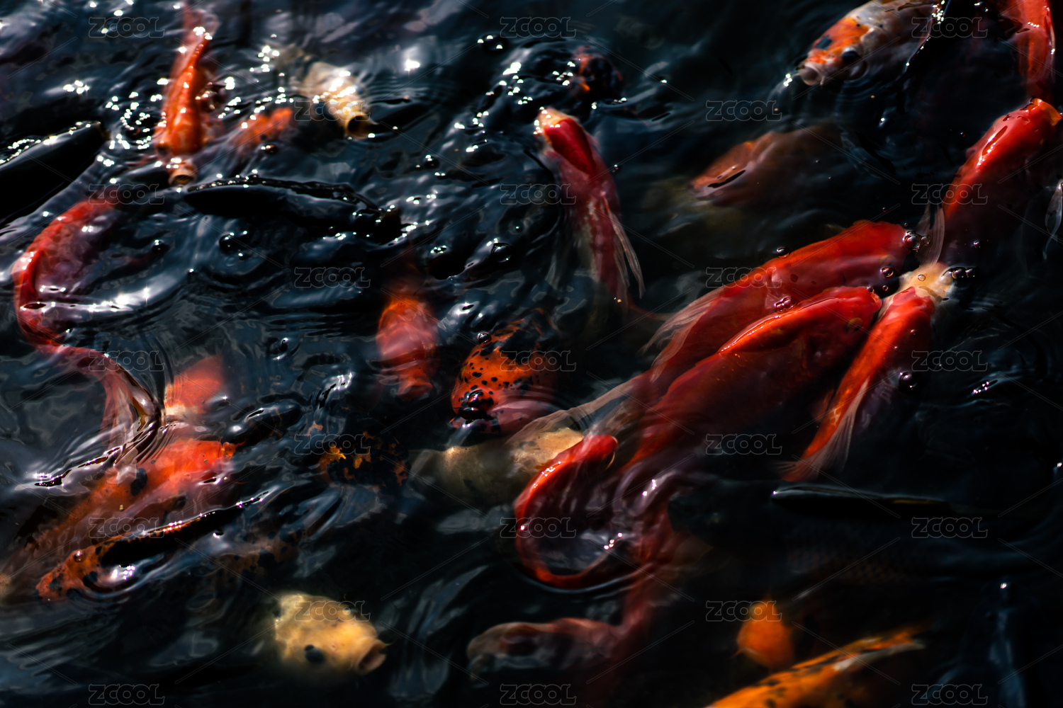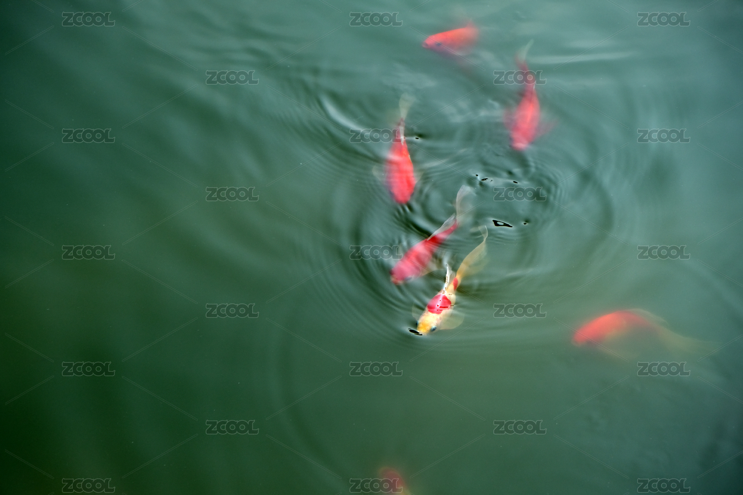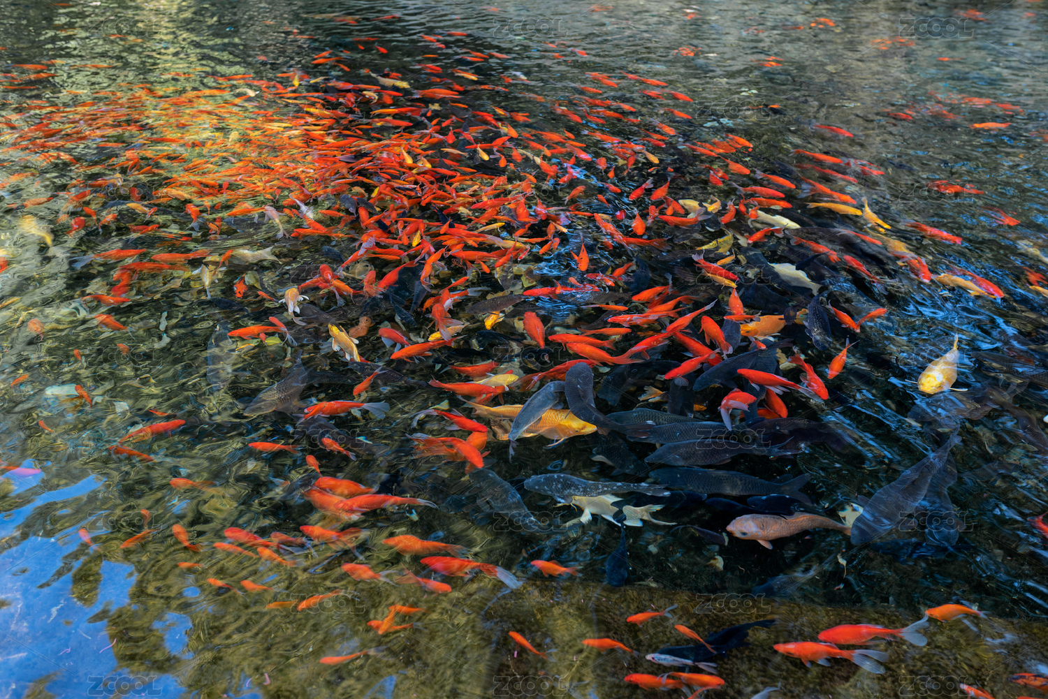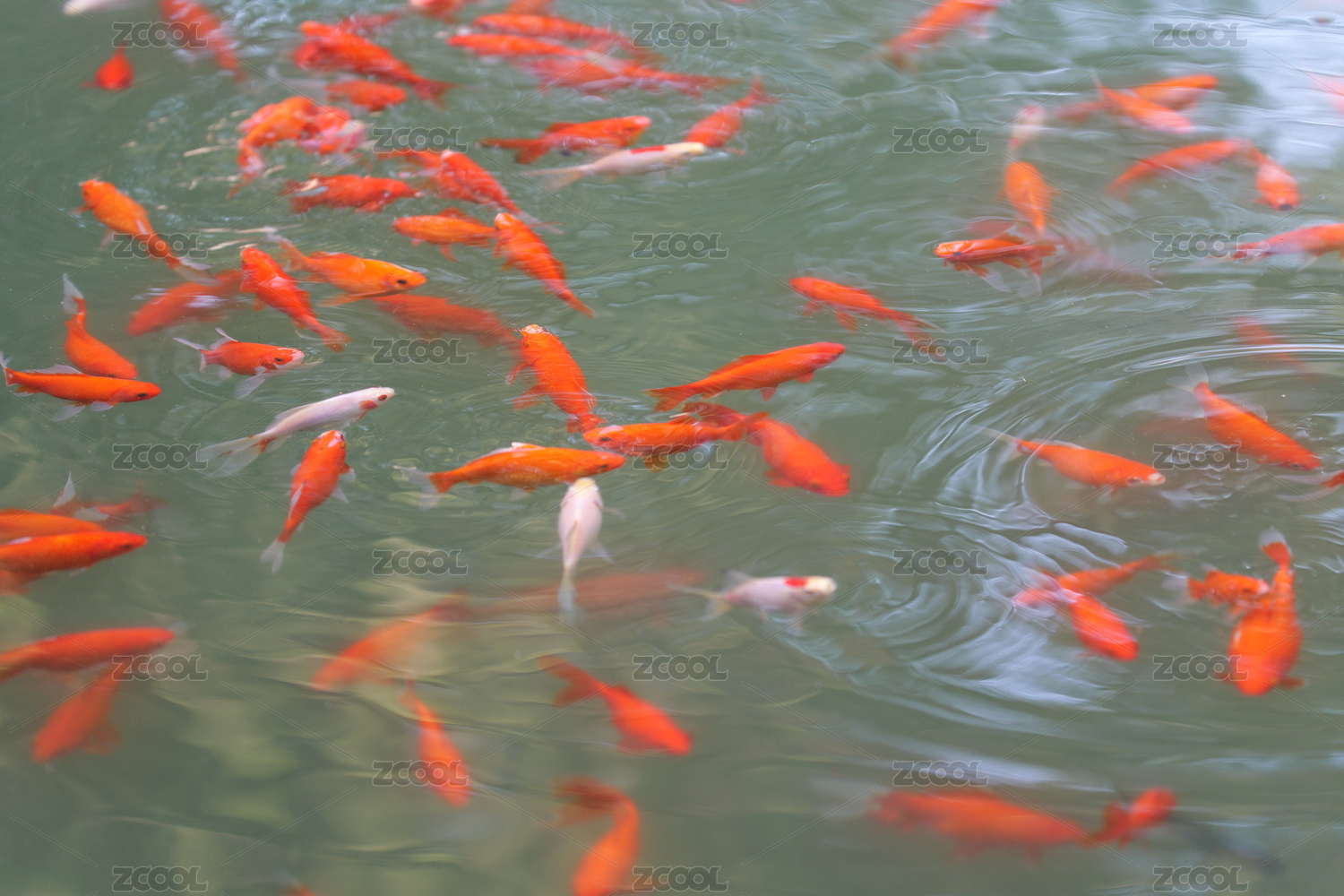 許多鮮艷紅色的錦鯉鯉魚在水池里游動
