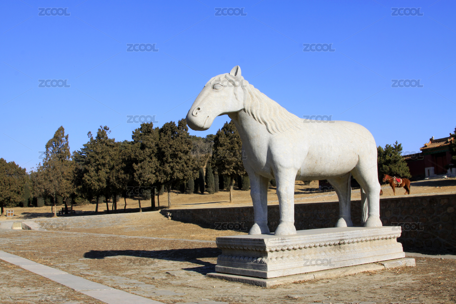 石雕白馬立于庭院