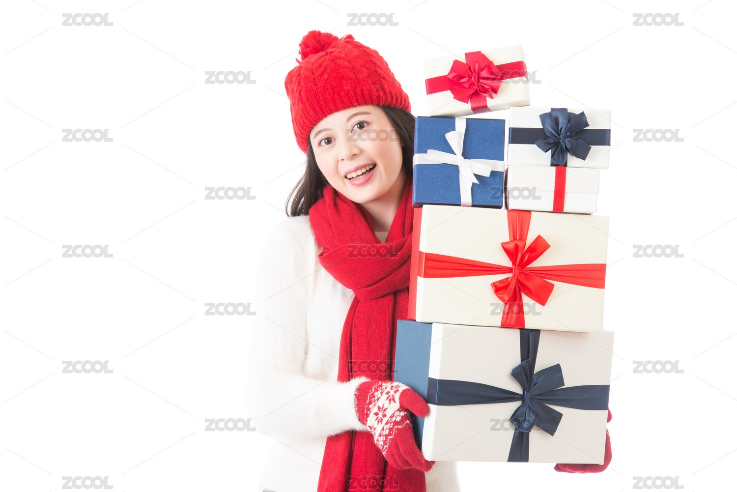 女人購物捧在懷里穿著冬衣許多圣誕禮物。年輕漂亮的亞洲女模特在白色背景孤立