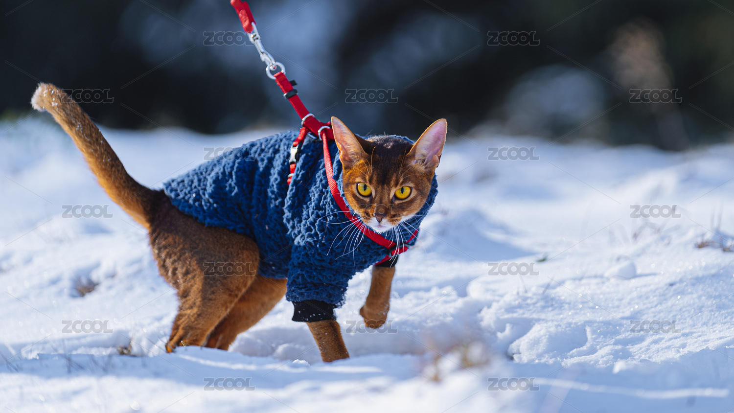 雪地里,一只阿比西尼亞貓咪穿著冬衣在踩雪