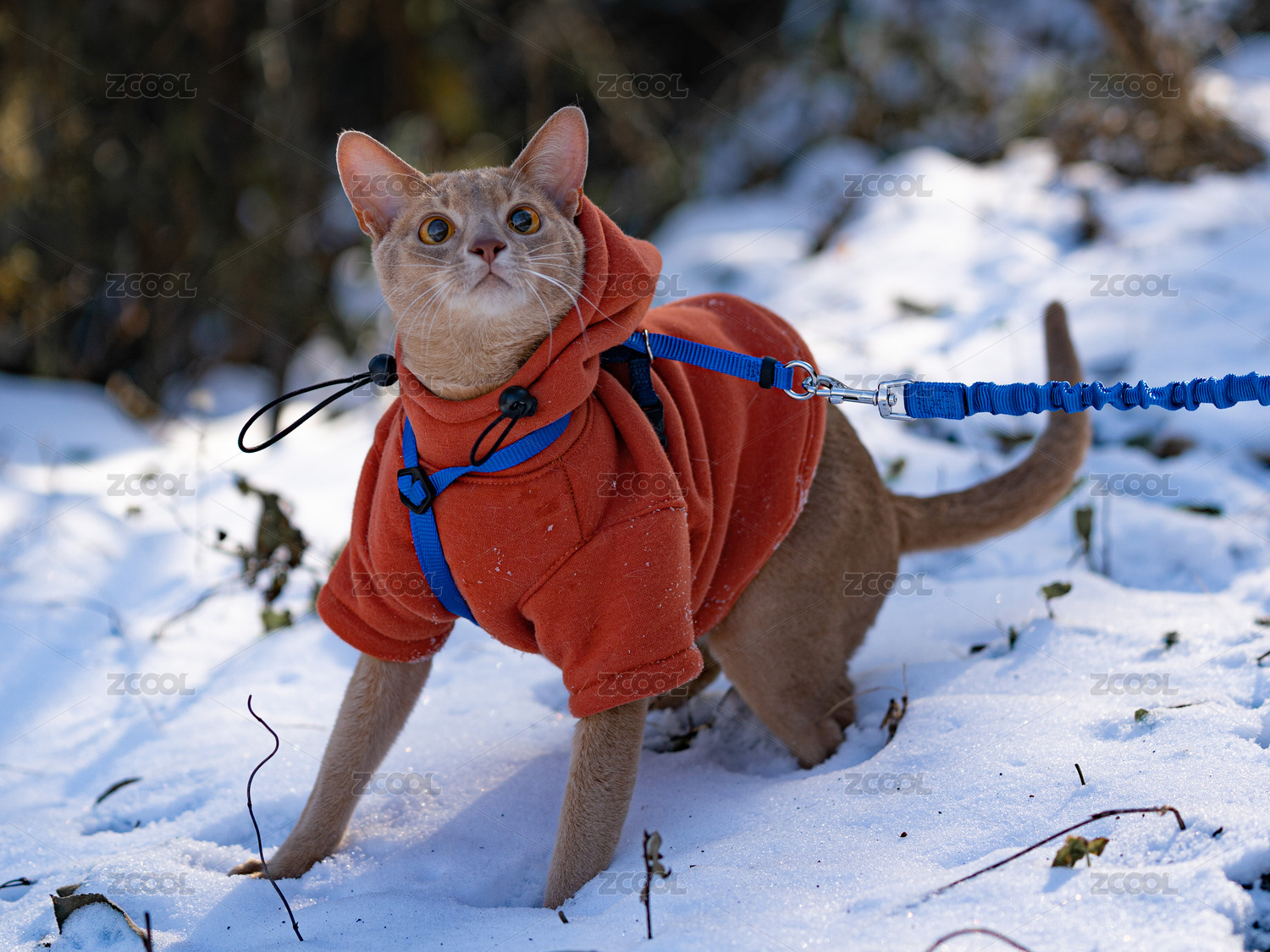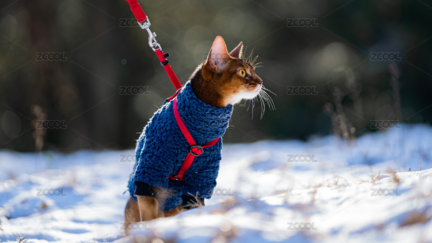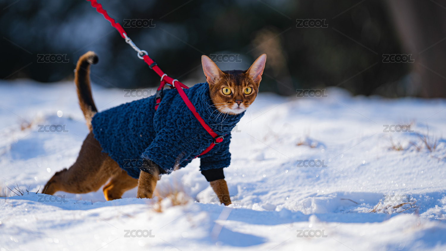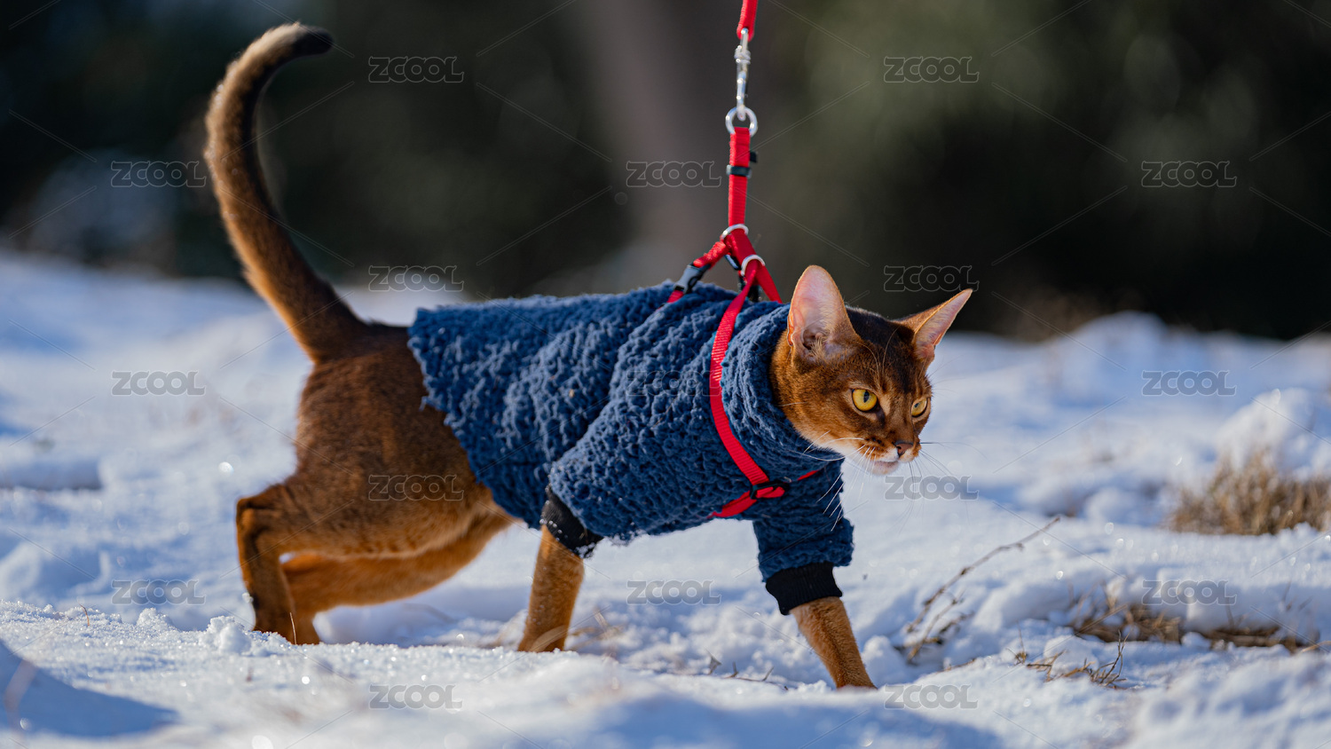 雪地里,一只阿比西尼亞貓穿著冬衣在踩雪