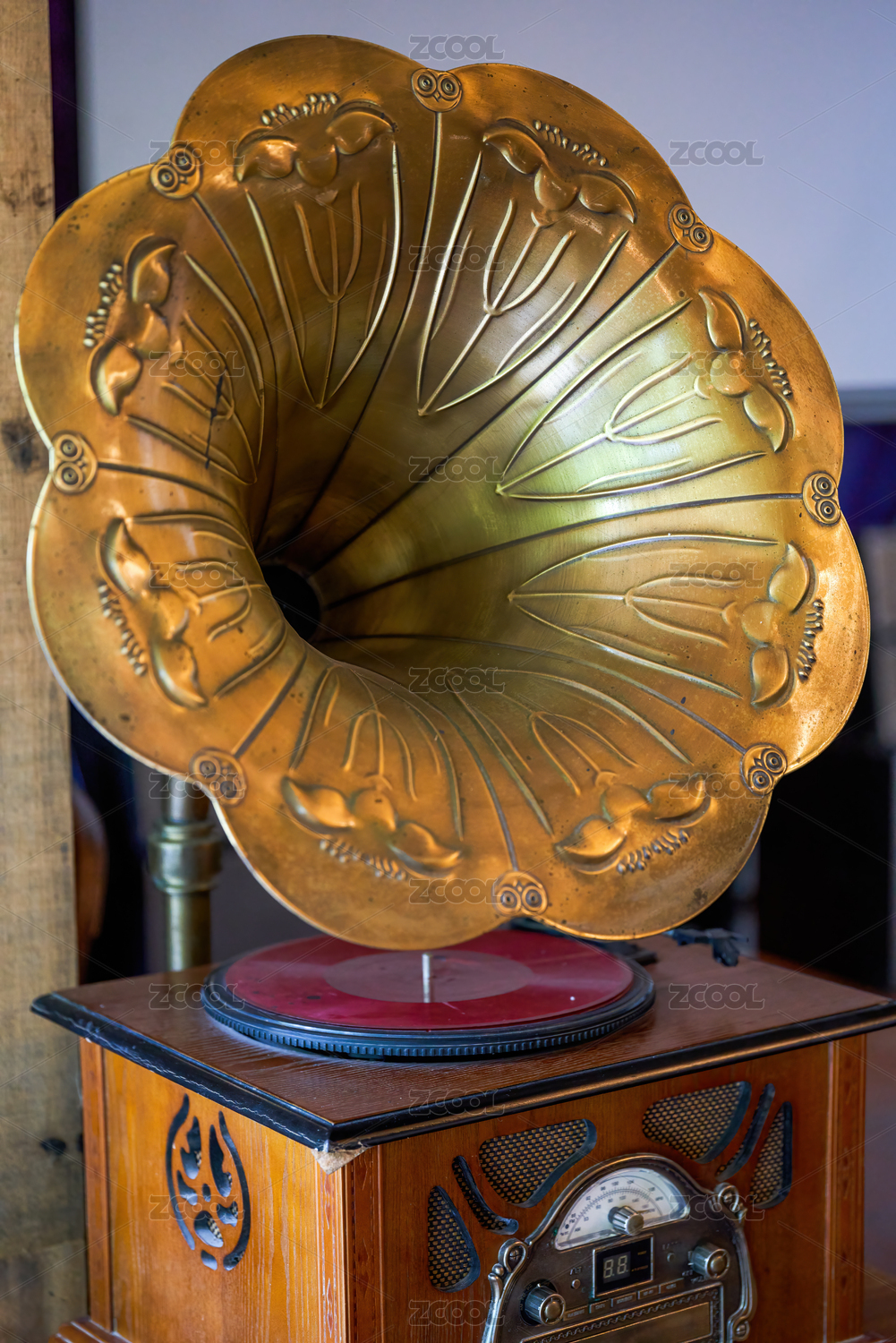 一臺(tái)復(fù)古的留聲機(jī)喇叭特寫(xiě)