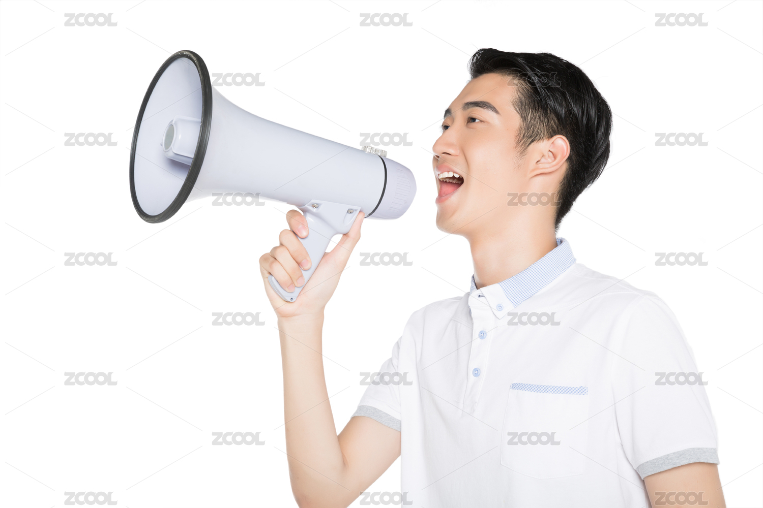 影棚拍攝,拿著一個(gè)擴(kuò)音器的年輕男青年
