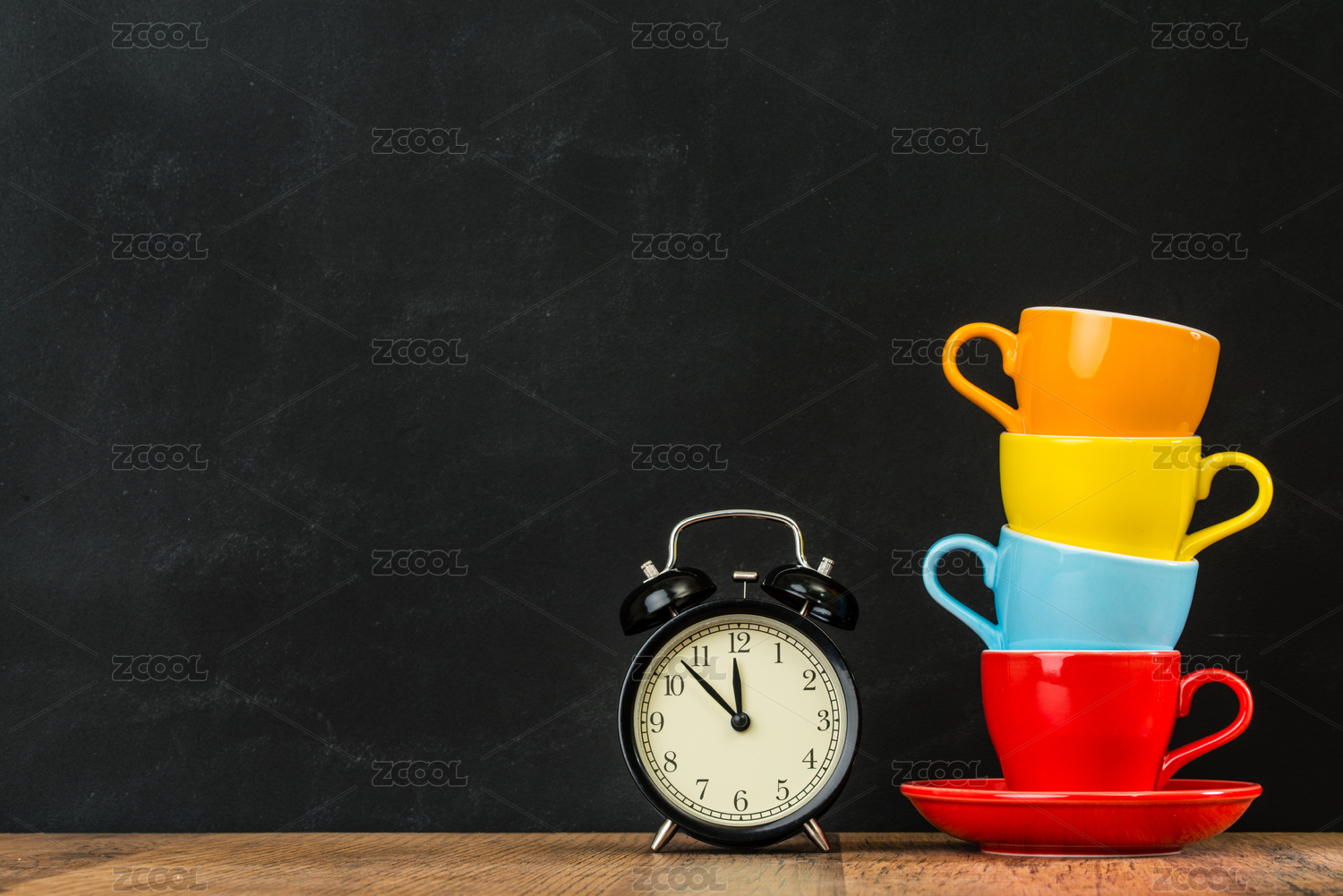 對木材紋理地板上有四個堆疊色澤誘人的咖啡杯創(chuàng)意工作室的黑板墻背景復古小鬧鐘顯示設計COPYSPACE。