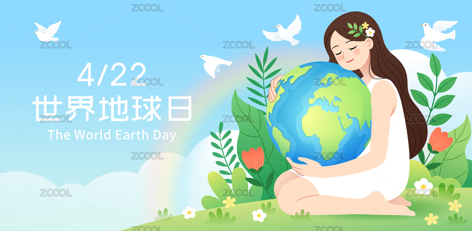 女孩抱著地球和藍天花叢等插畫