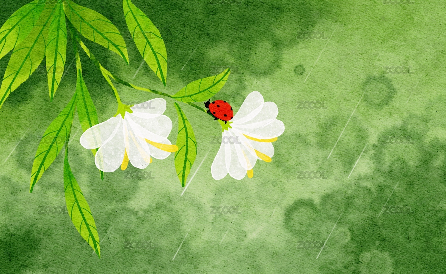 春天花朵上的七星瓢蟲水彩插畫