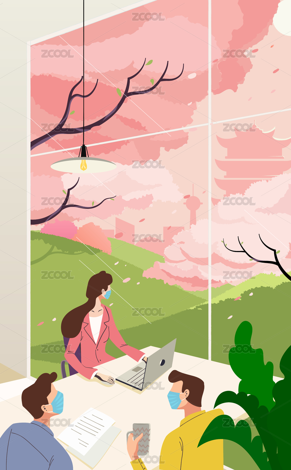 春天花開時白領(lǐng)戴口罩坐在窗邊上班