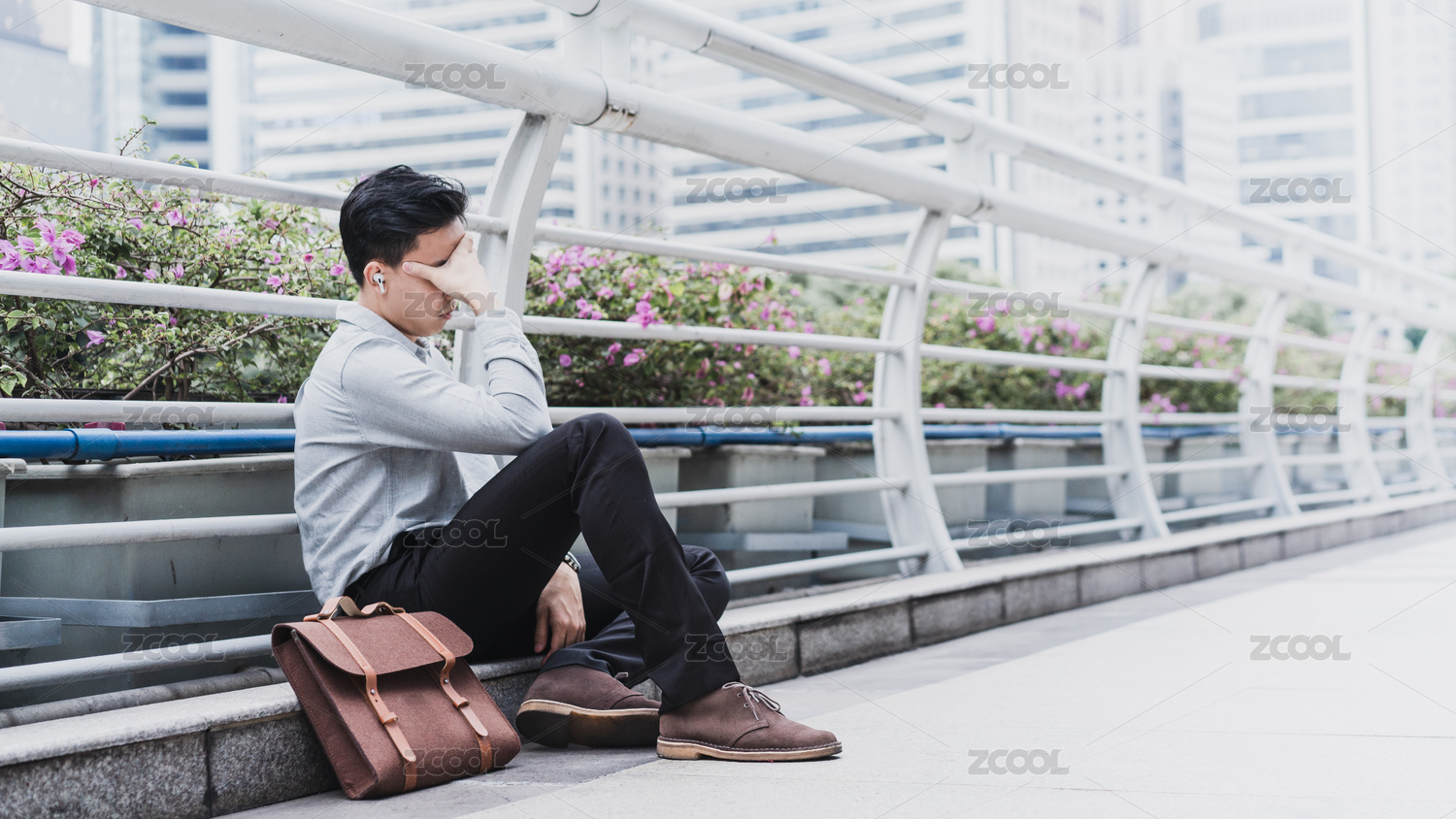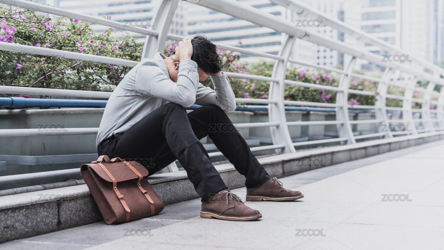 失敗的商務(wù)人士沮喪地坐在天橋邊