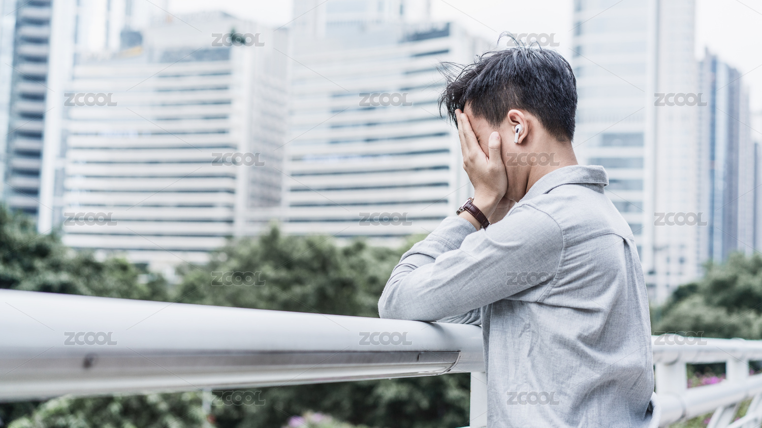 沮喪的商務(wù)人士靠著欄桿雙手捂臉