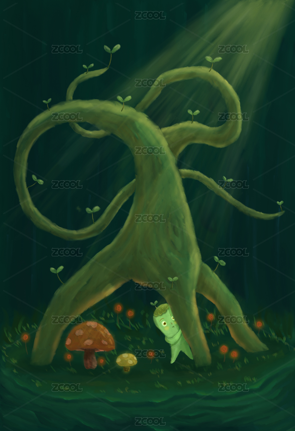 黑夜一縷陽(yáng)光映照大樹(shù)底下小精靈害羞