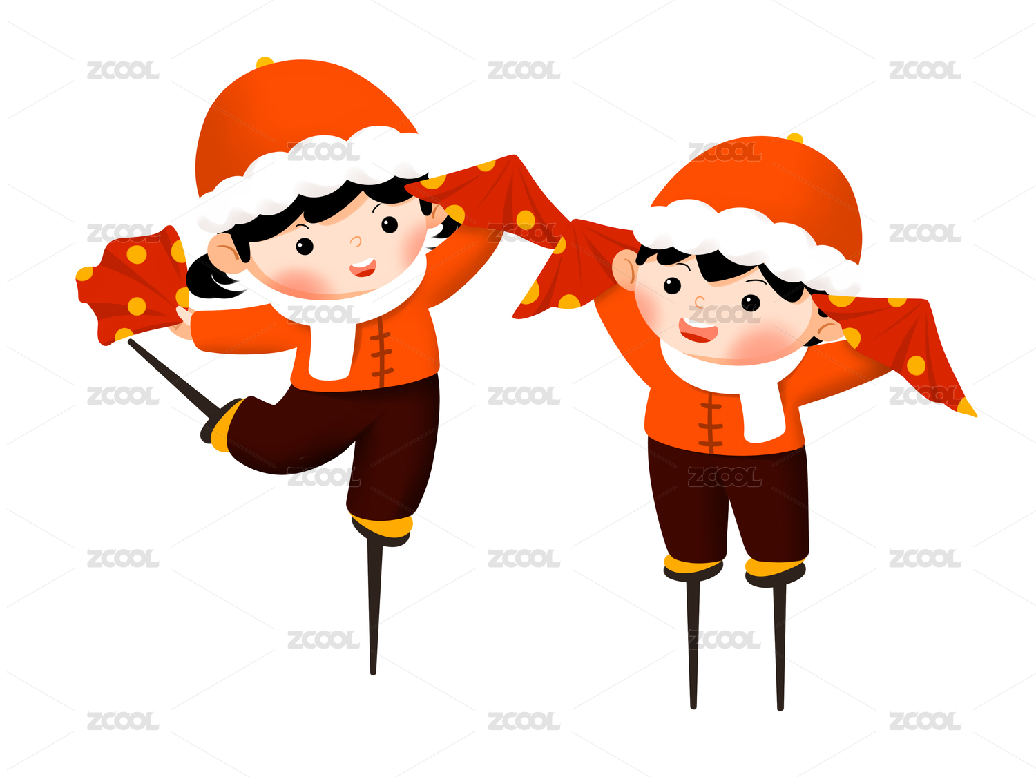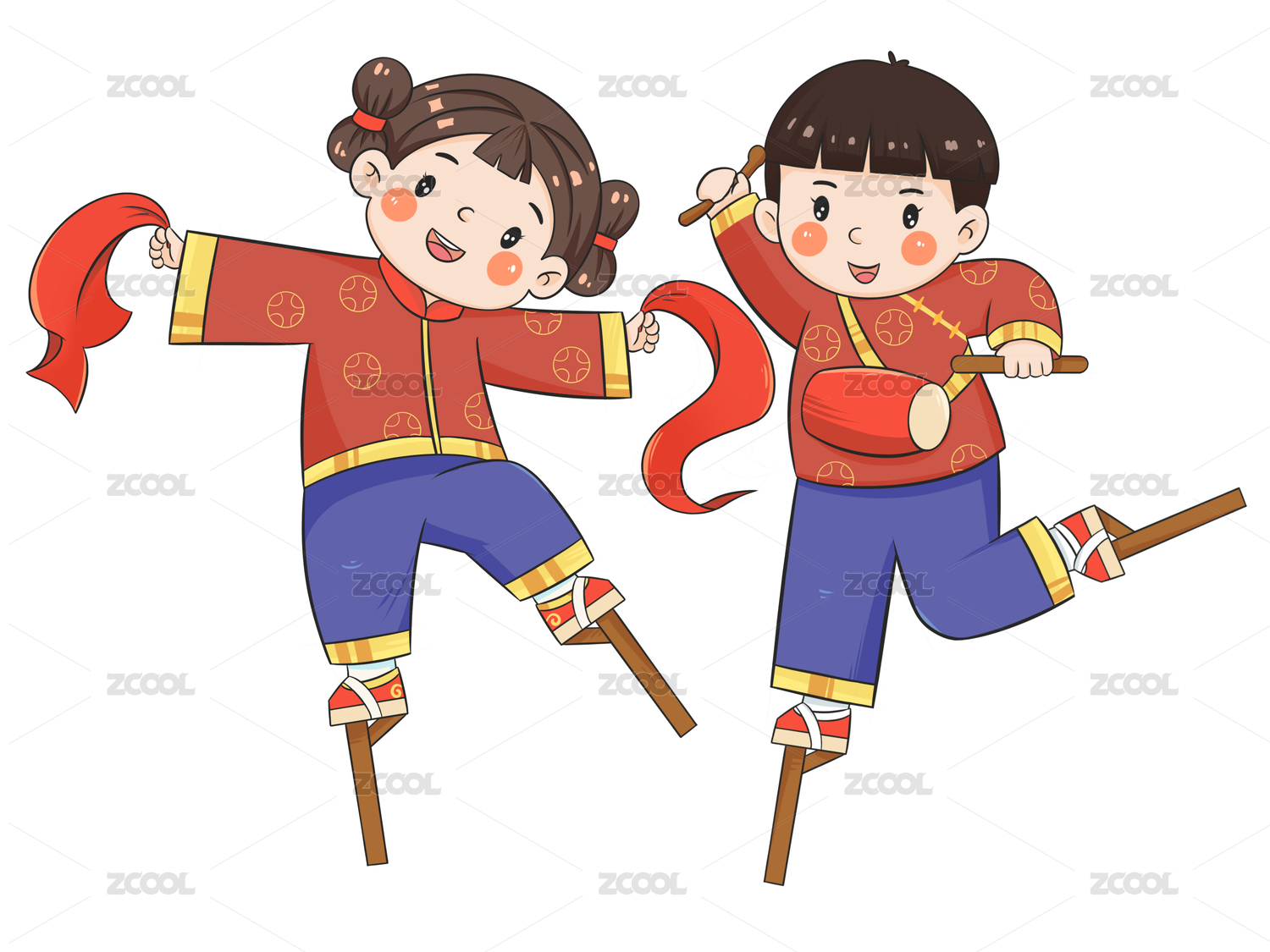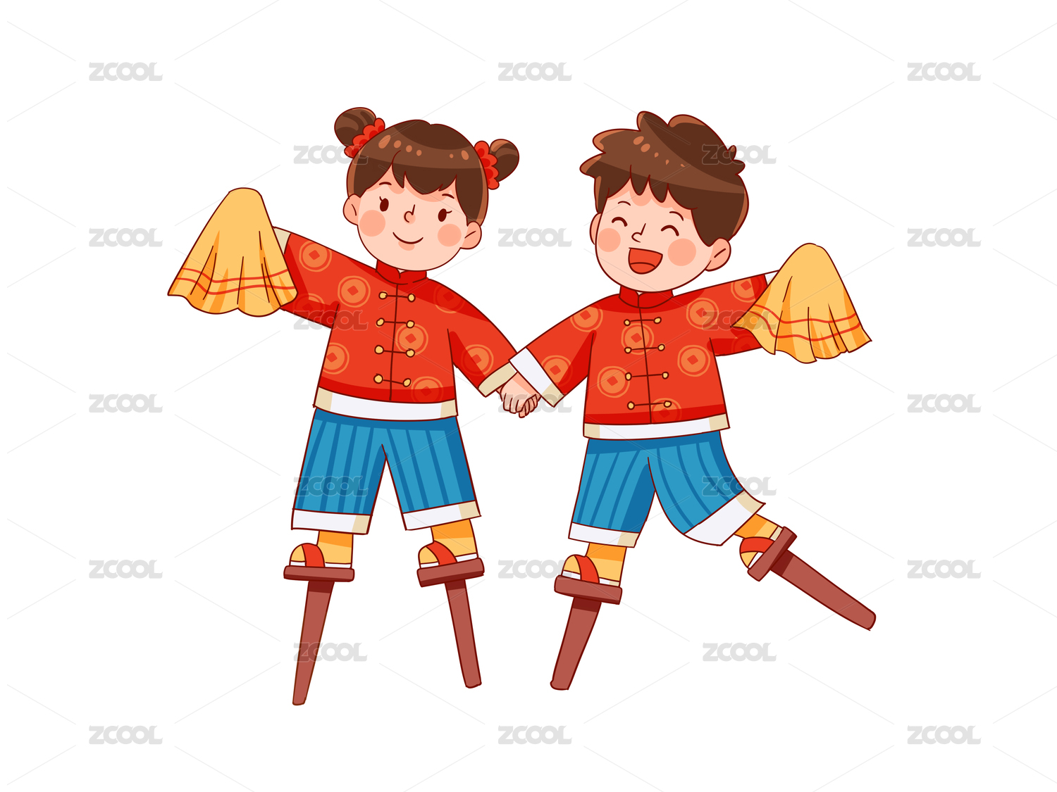 紅色卡通開心兒童踩高蹺拿絲巾跳秧歌元素