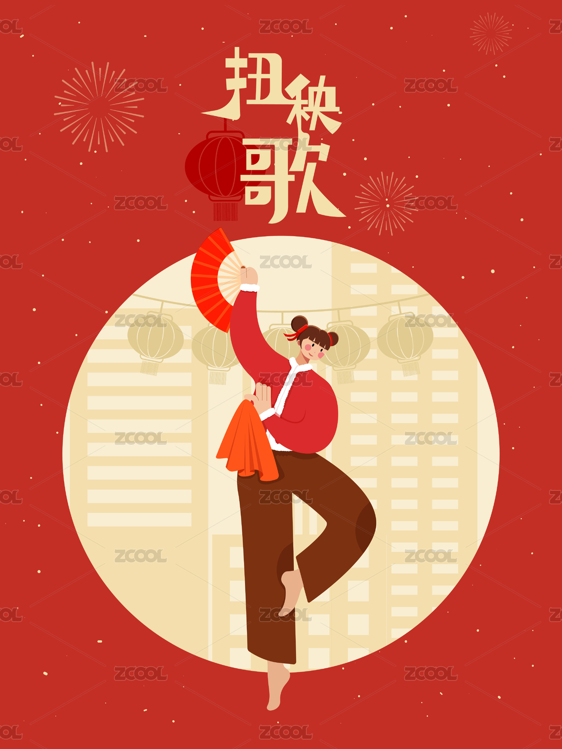 紅色卡通男生女生拉手踩高蹺拿手帕跳秧歌元素