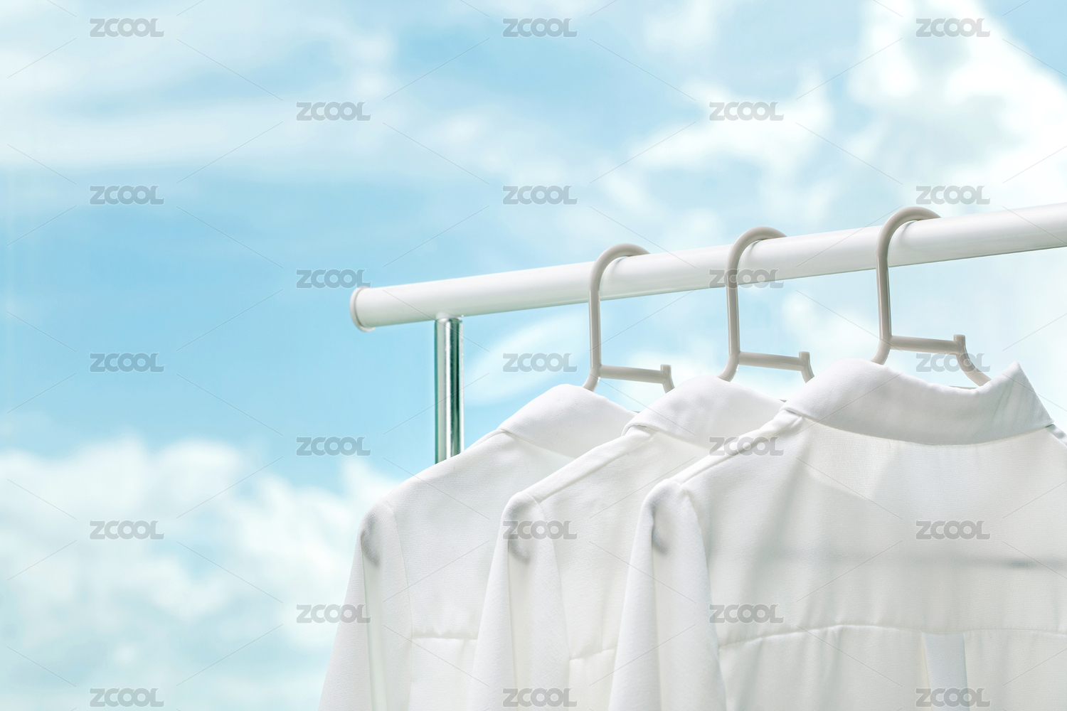 仰視藍(lán)天下掛在架子上晾曬的襯衣特寫