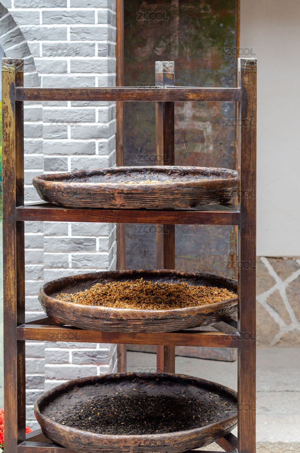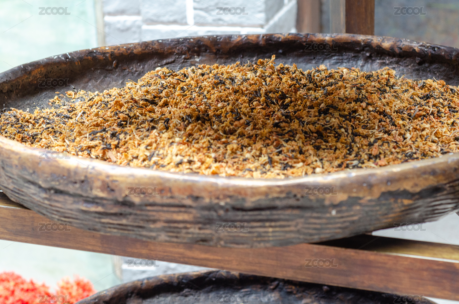晾曬在簸箕中的茉莉花茶