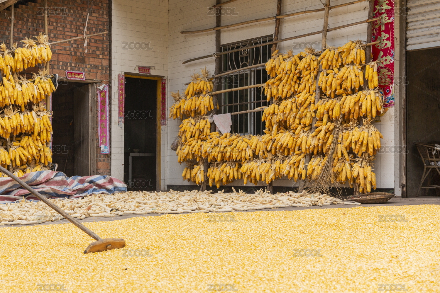 農(nóng)村豐收玉米掛架晾曬圖