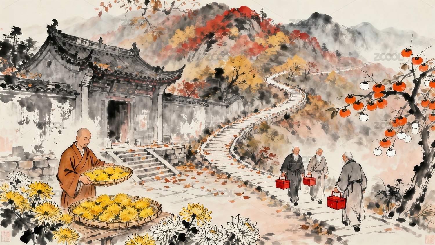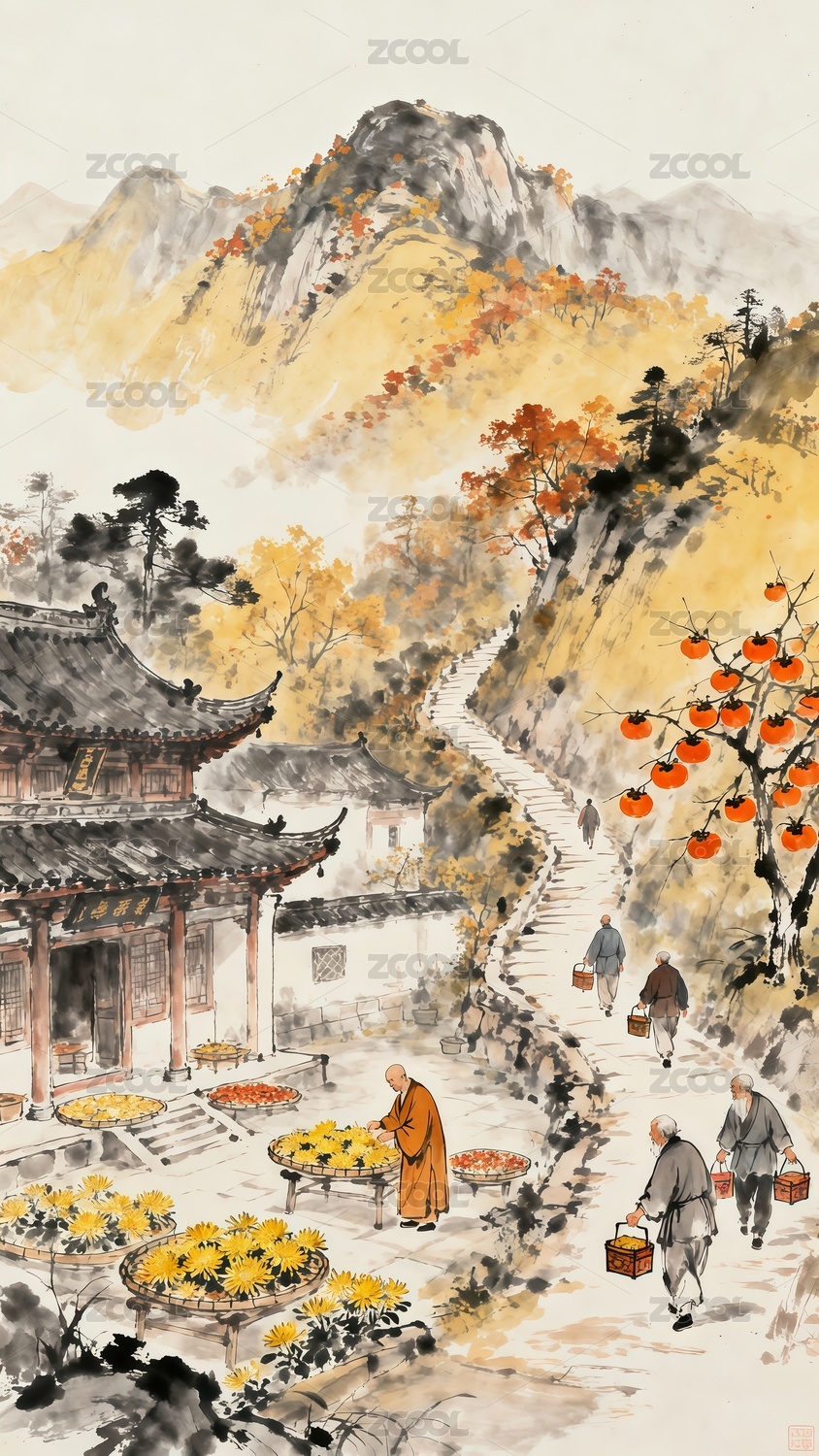 重陽節(jié)僧人在庭院中晾曬菊花水墨風(fēng)格插畫