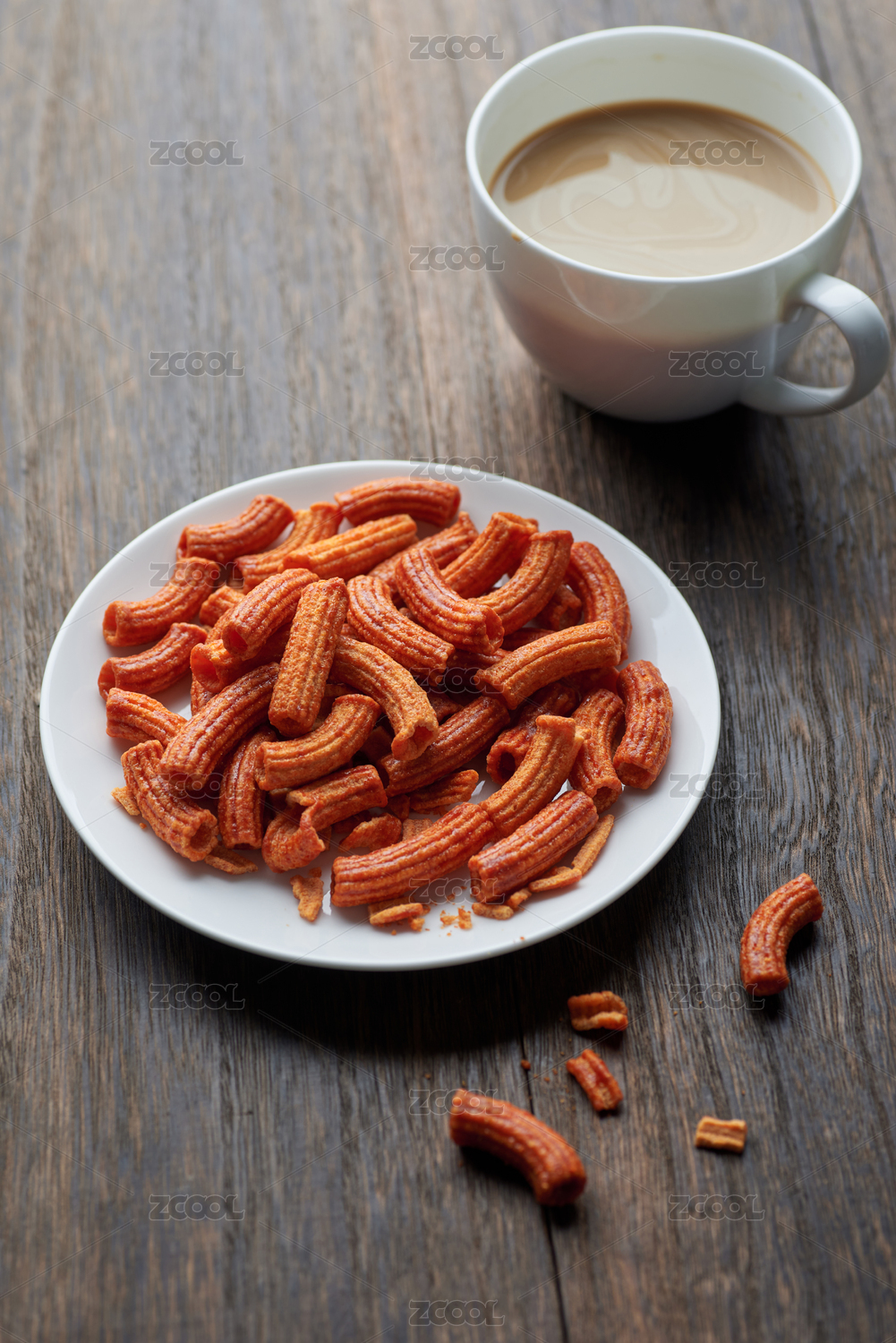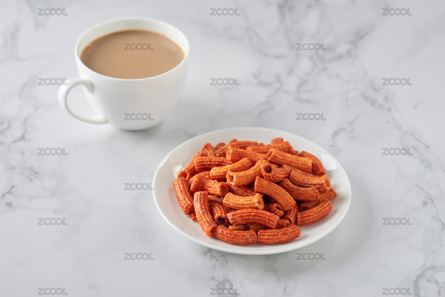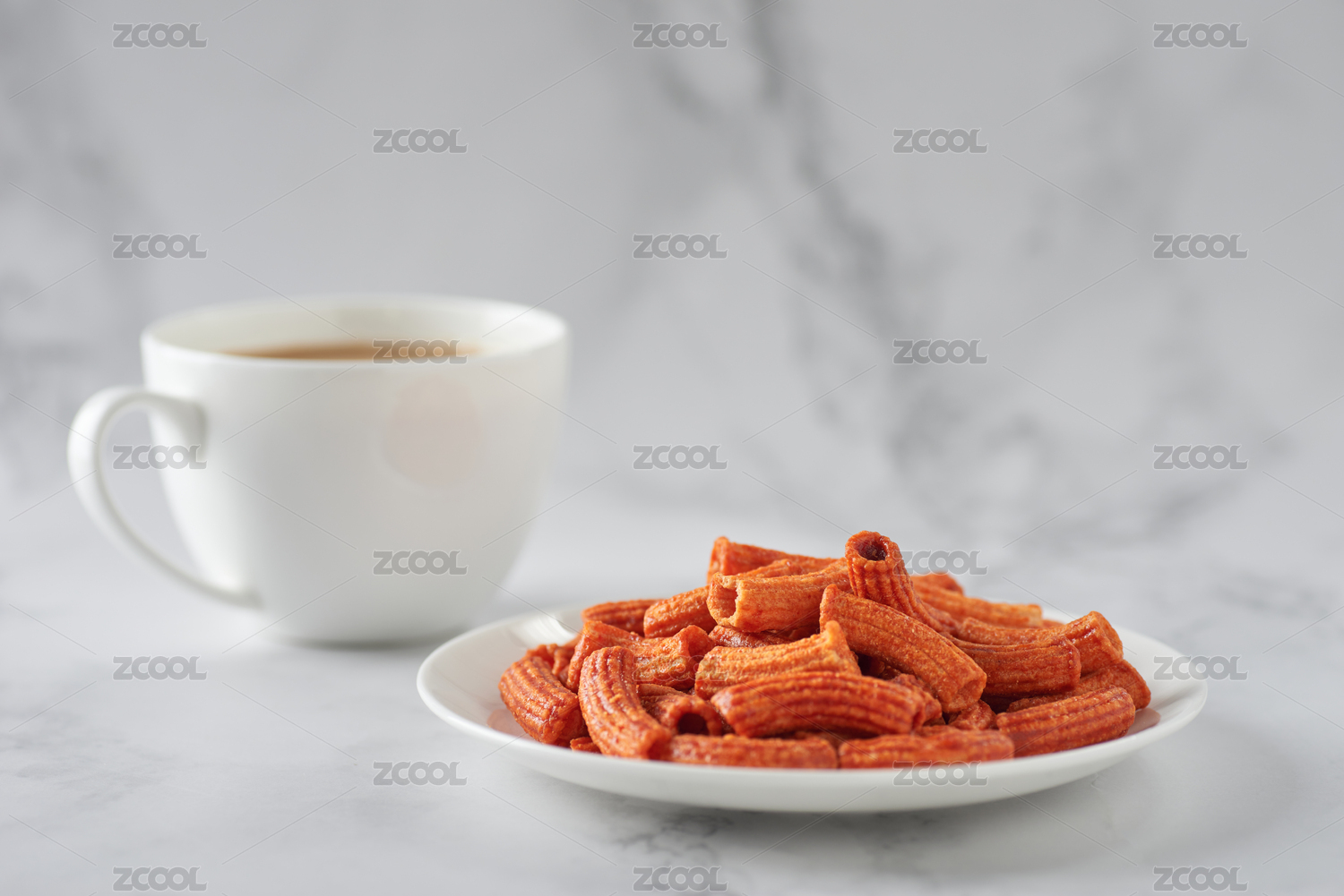 香脆可口的韓式香辣年糕條和拿鐵咖啡