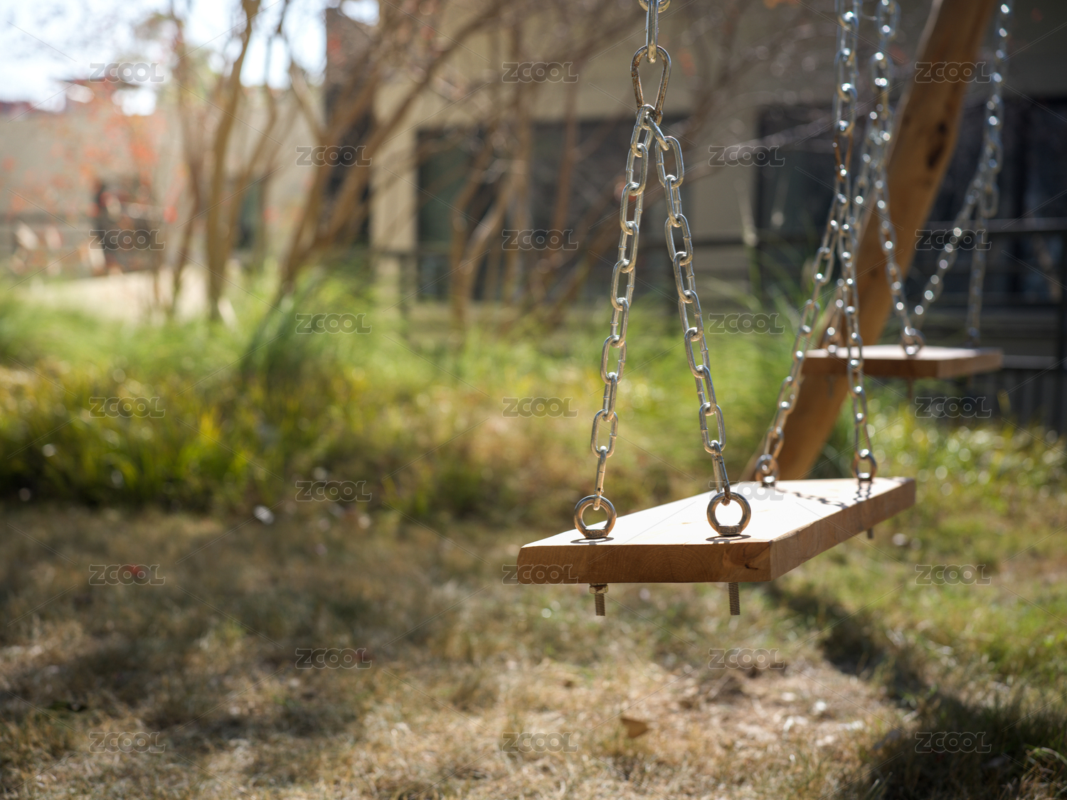 白天公園里草地上的木板秋千