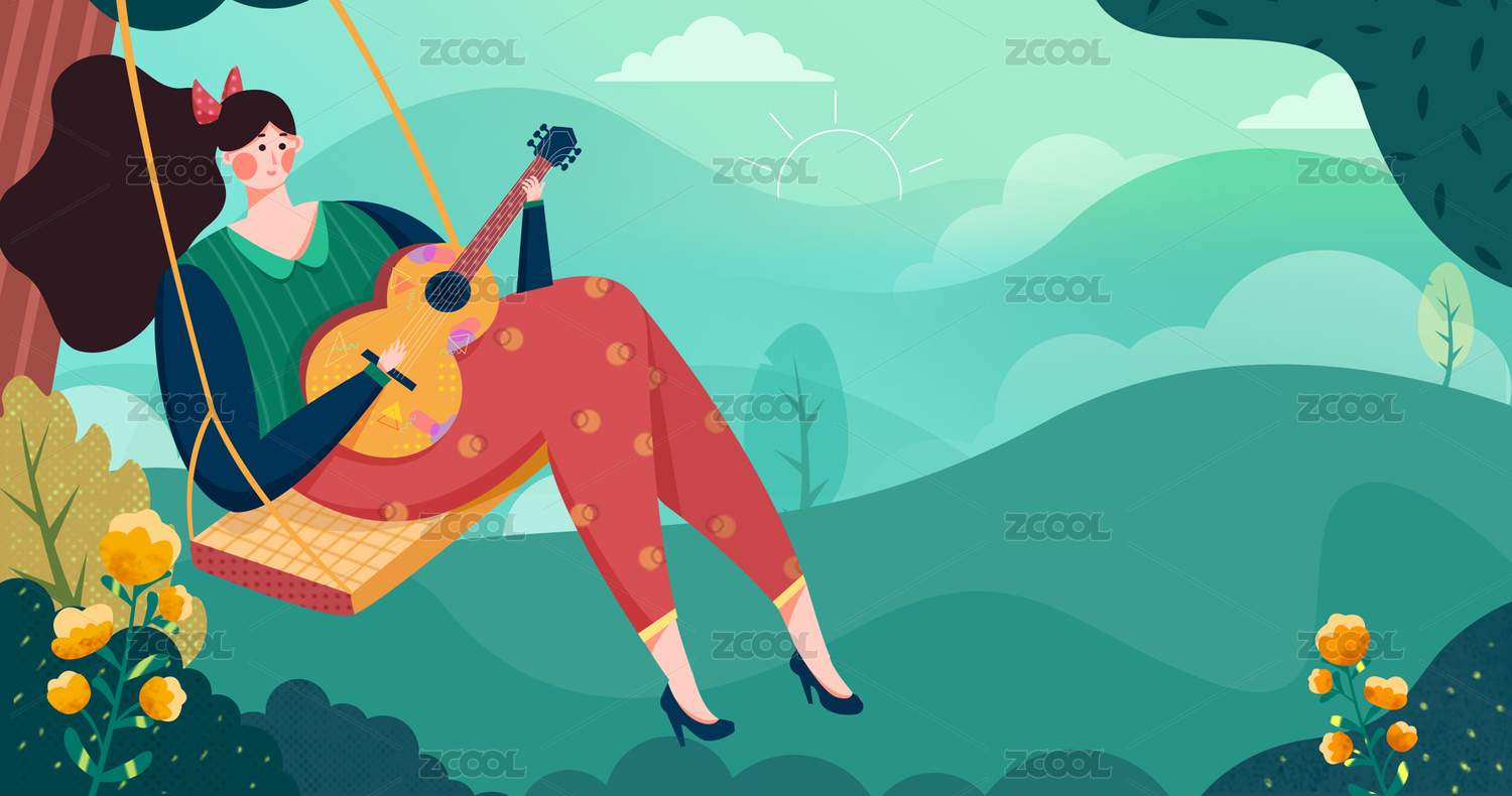 夏夜在樹下蕩秋千的少女橫版