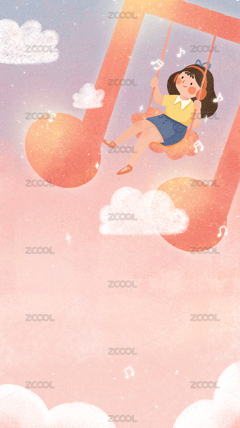 在天空聽音樂蕩秋千的小女孩