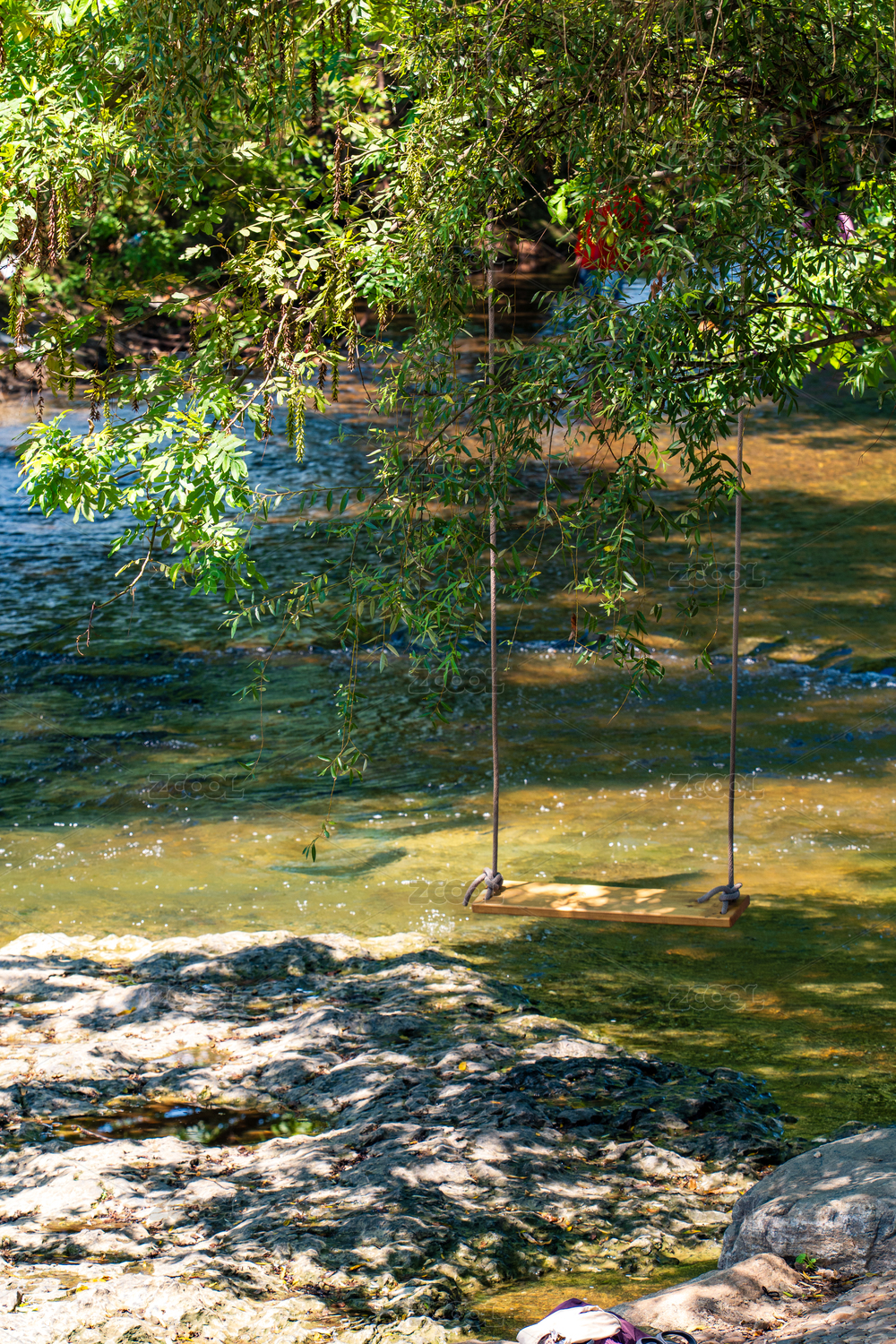 綠意環(huán)繞的清涼溪流與樹間的秋千