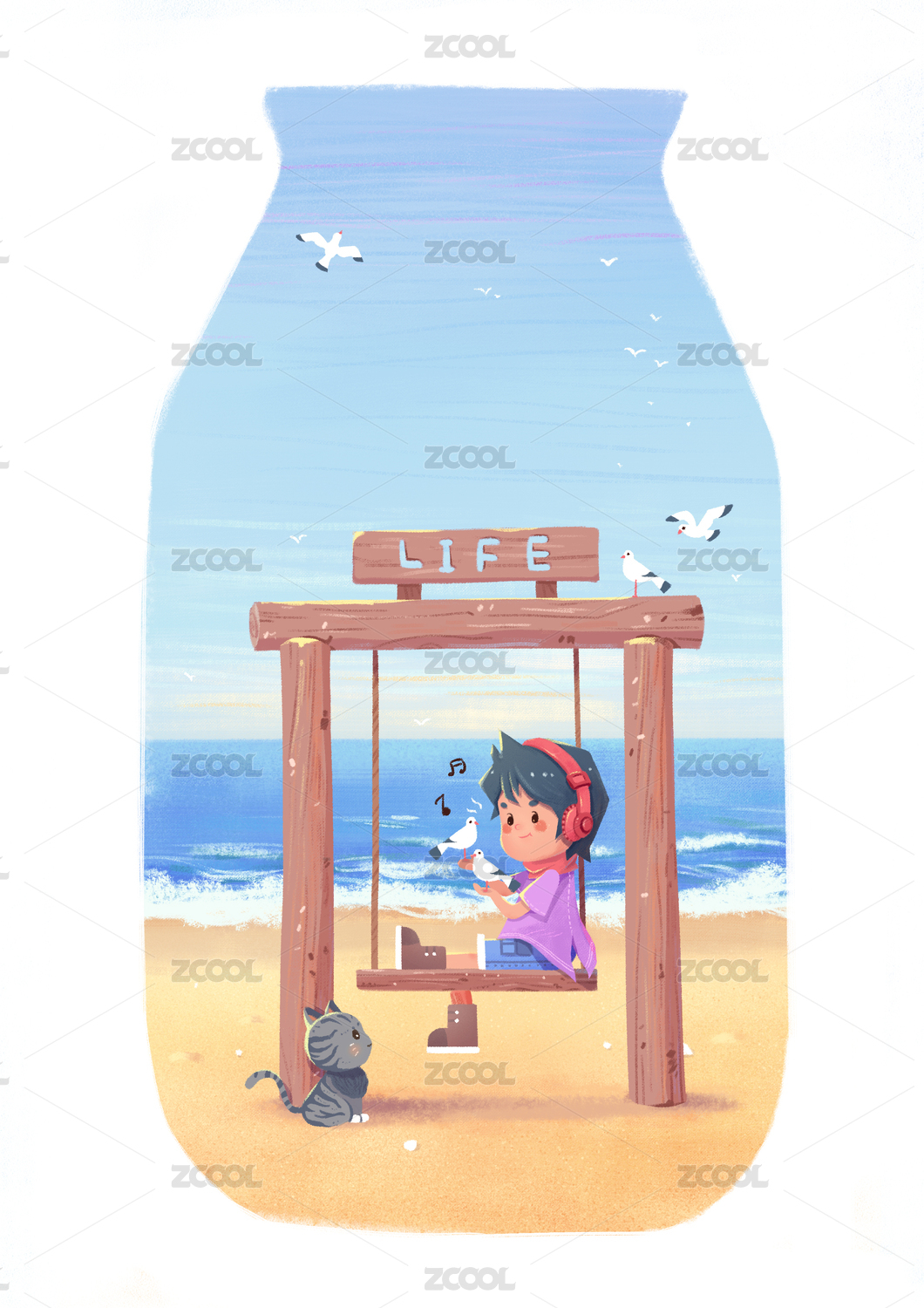 卡通海邊蕩秋千聽音樂的小男孩裝飾插畫