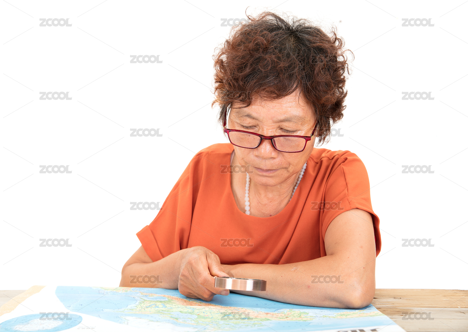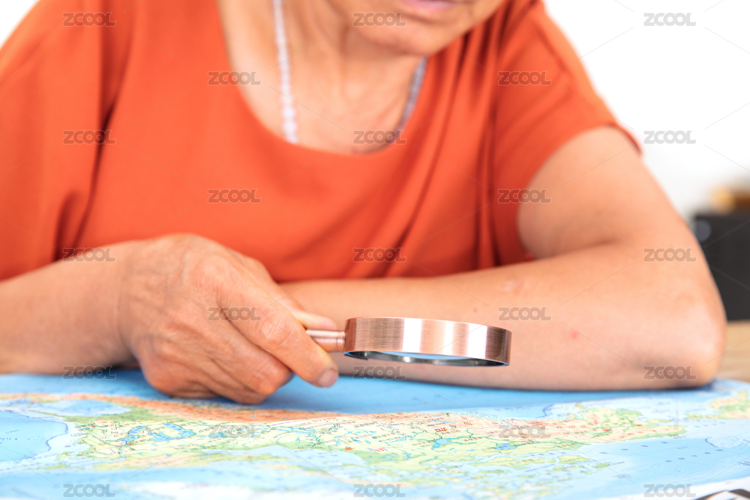 中國老太太手持放大鏡認(rèn)真的查看世界地圖