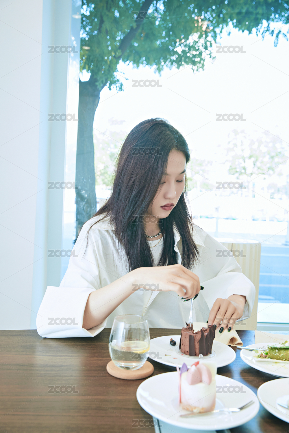 在烘焙店吃蛋糕喝飲料的可愛亞洲少女