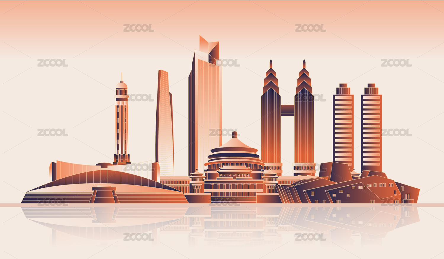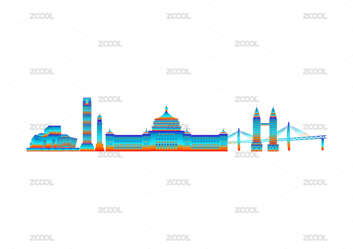 重慶地標(biāo)建筑,藍(lán)色和紅色漸變矢量插畫