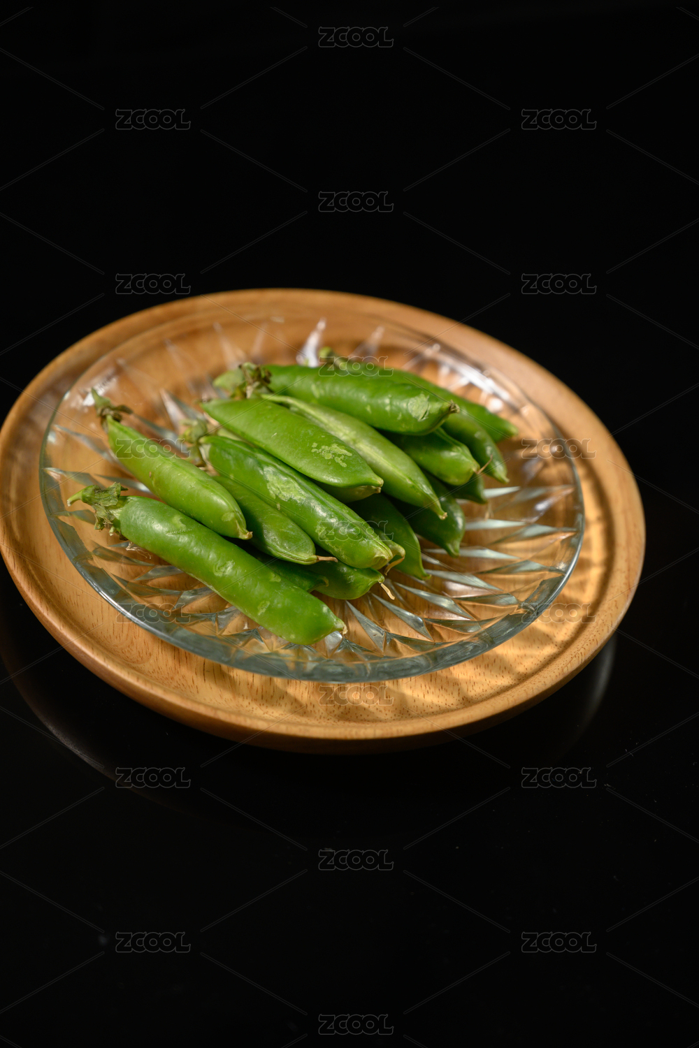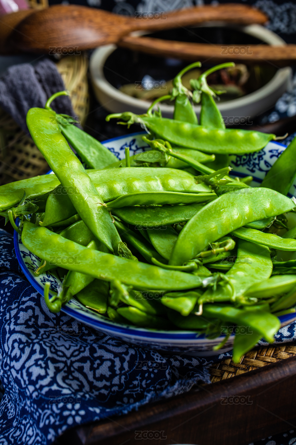 放在木托上的一盤豌豆莢