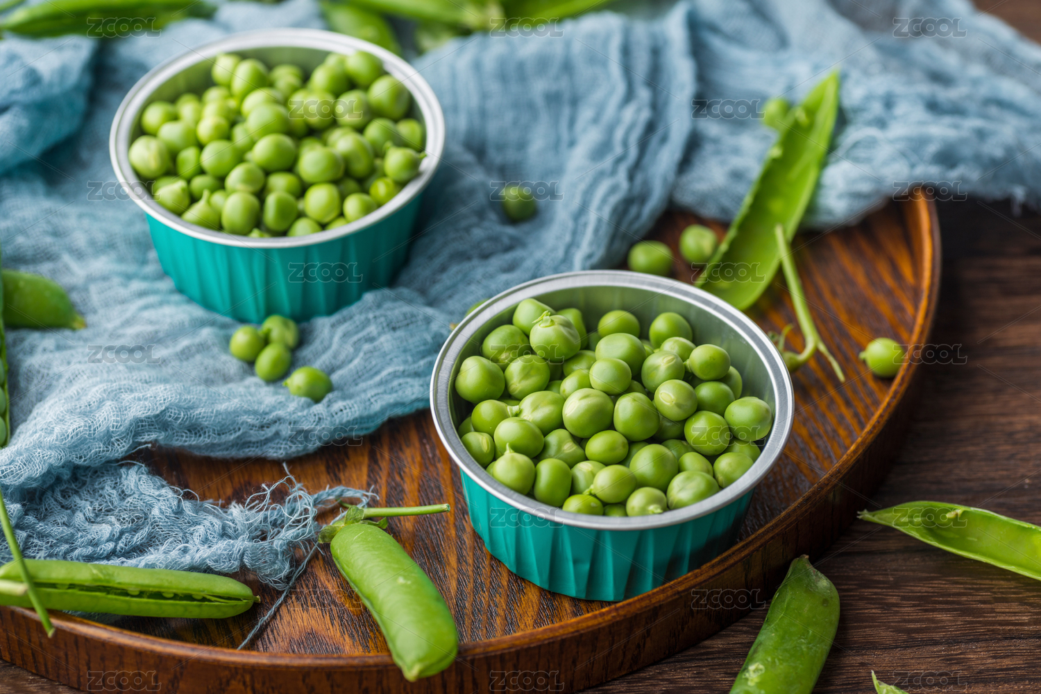 木板上放著一藍(lán)新鮮豌豆莢