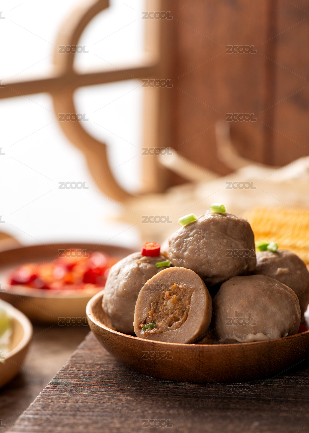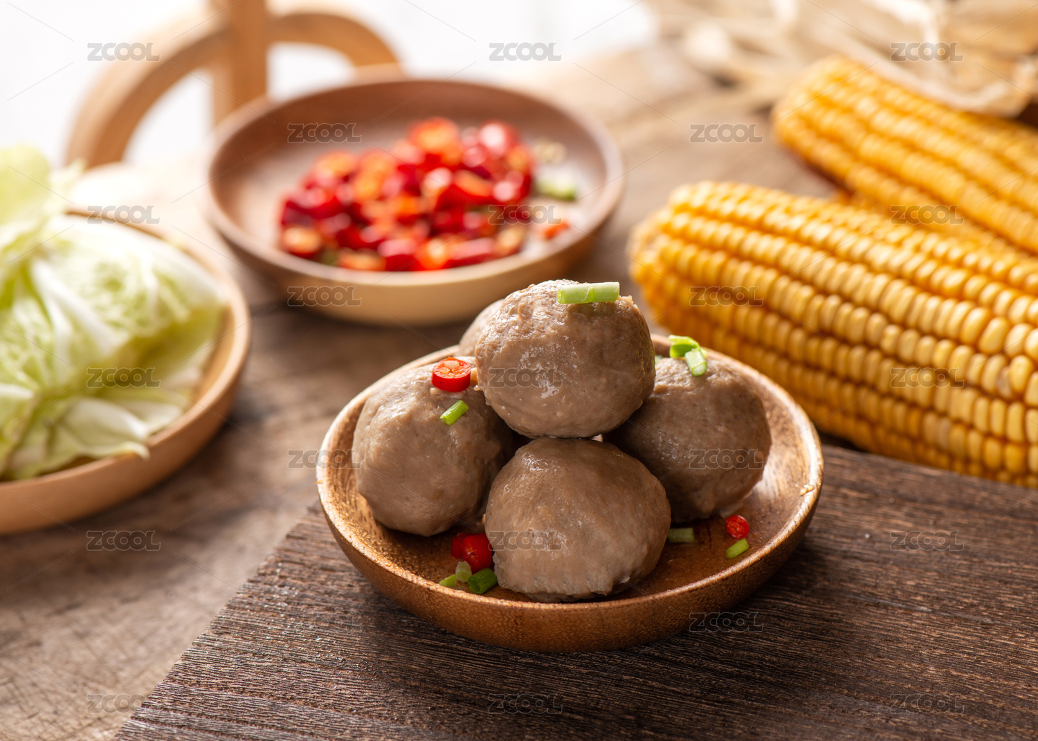 老桌子白盤里的四川重慶火鍋菜品牛肉丸子