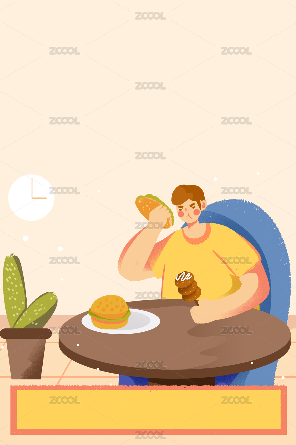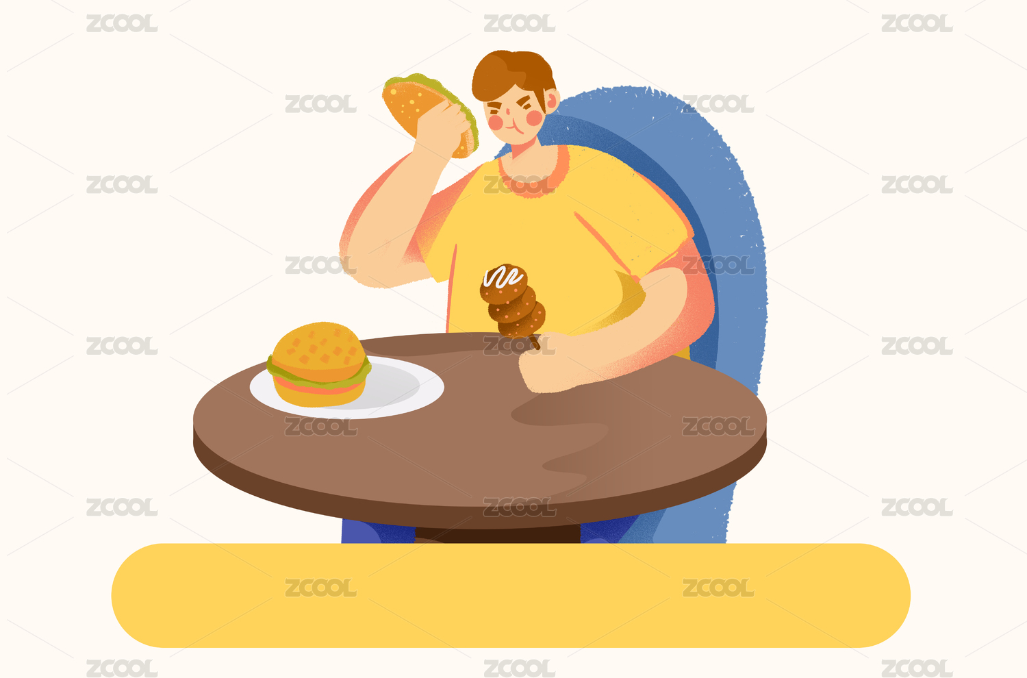 卡通手繪胖子吃漢堡插畫